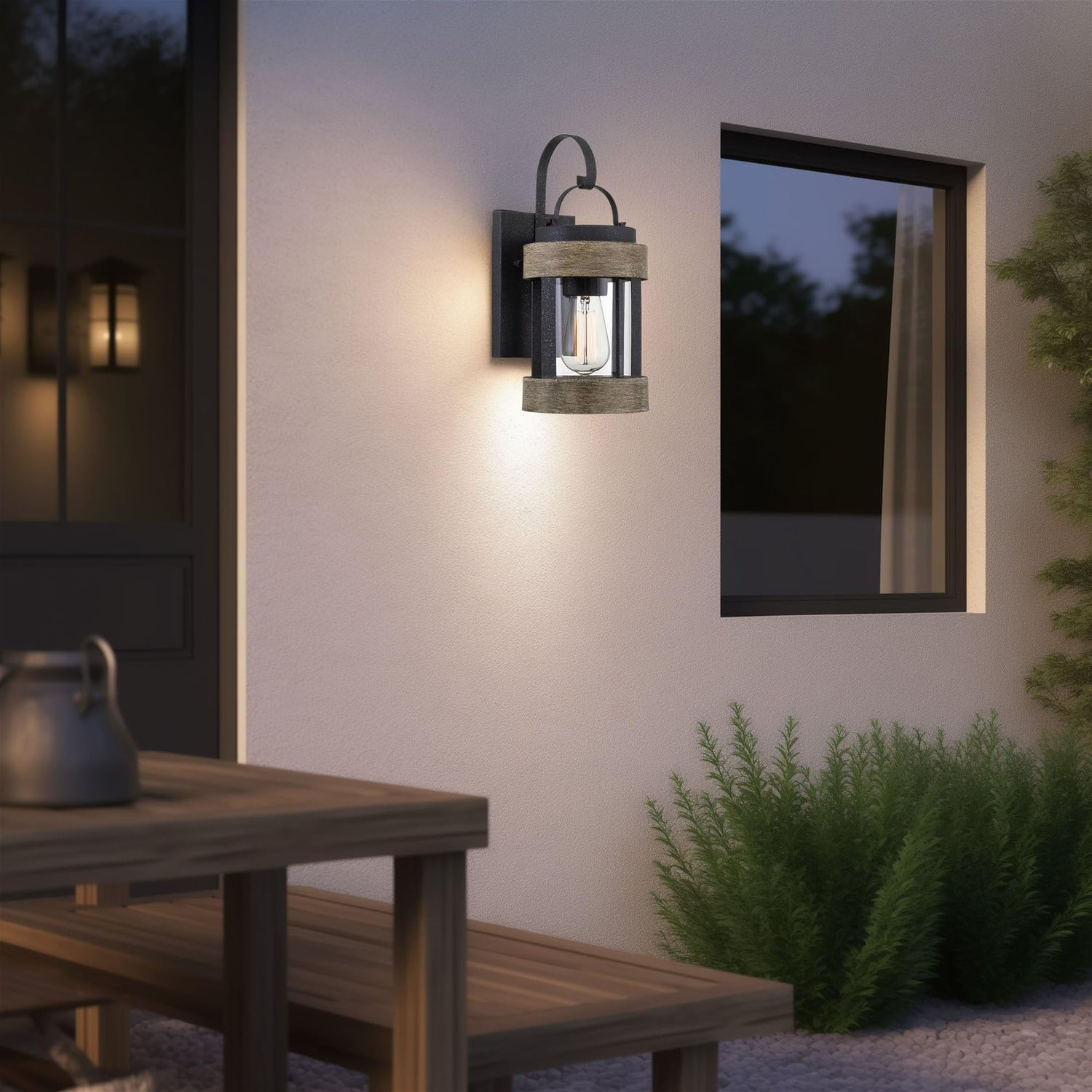• [RUSTIC MODERN DESIGN] This traditional rustic wall sconce embodies careful attention to detail, showcasing an upscale weathered oak wood style with a complementary bold textured black finish and superior clear cylinder glass shade to instantly upgrade your front door exterior or porch. The refraction of light through the clear glass and open frame adds an artistic touch, making it a top choice amongst designers and builders