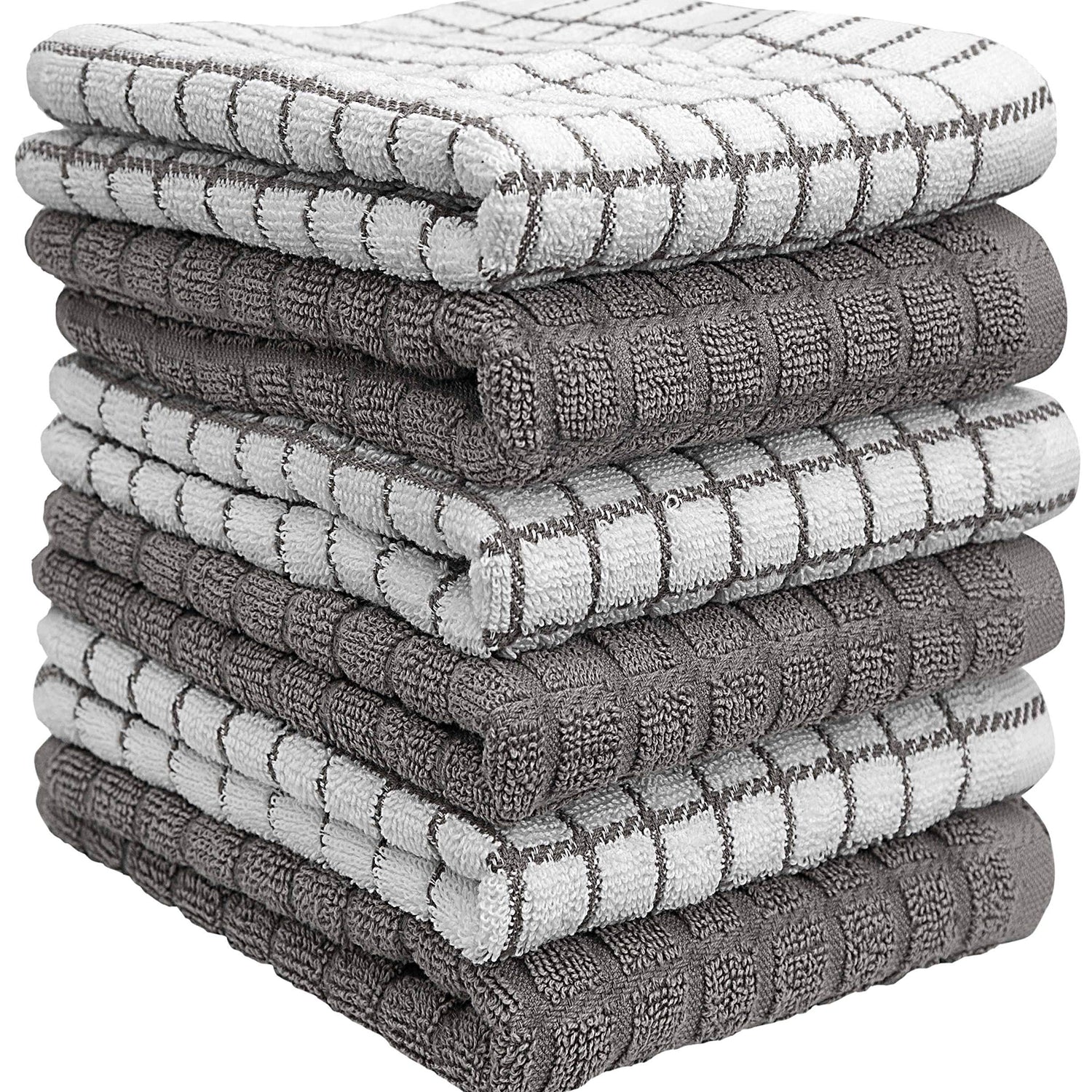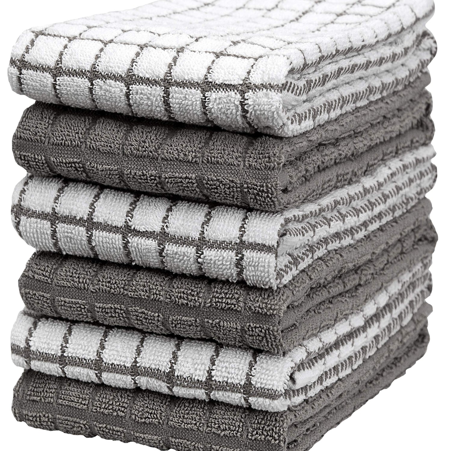 Kitchen Towels 16"x 28" | Dish Towels | Kitchen Hand Towels | Large Dishcloths Set | Highly Absorbent Tea Towel, Soft with Hanging Loop | Natural Ring Spun Cotton, 380 GSM | Gray Check Design - 6 Pack