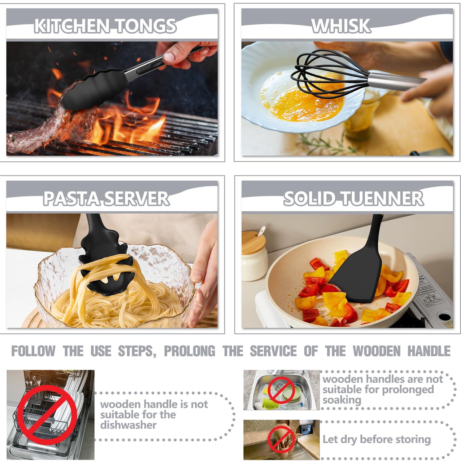 Kitchen Utensils Set- 34PCS Silicone Cooking Utensils with Holder, Umite Chef Heat Resistant Kitchen Utensil Spatula Set for Nonstick Cookware, Black Wooden Handles Kitchen Gadgets Tools Set