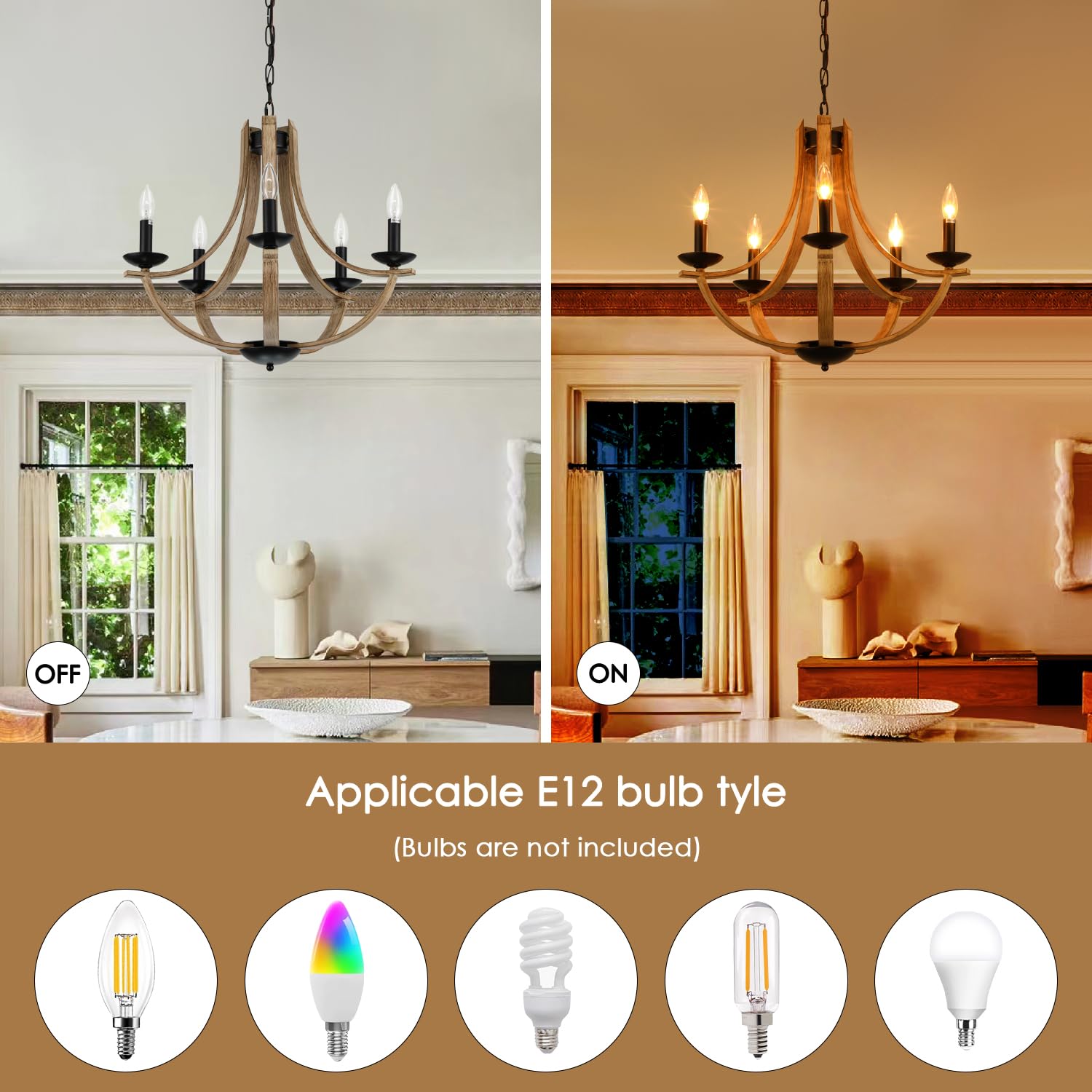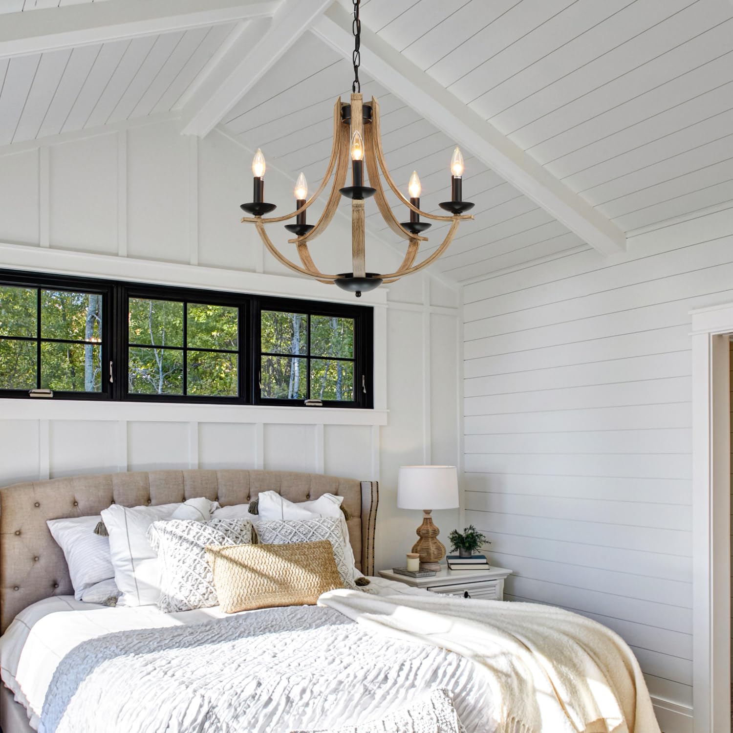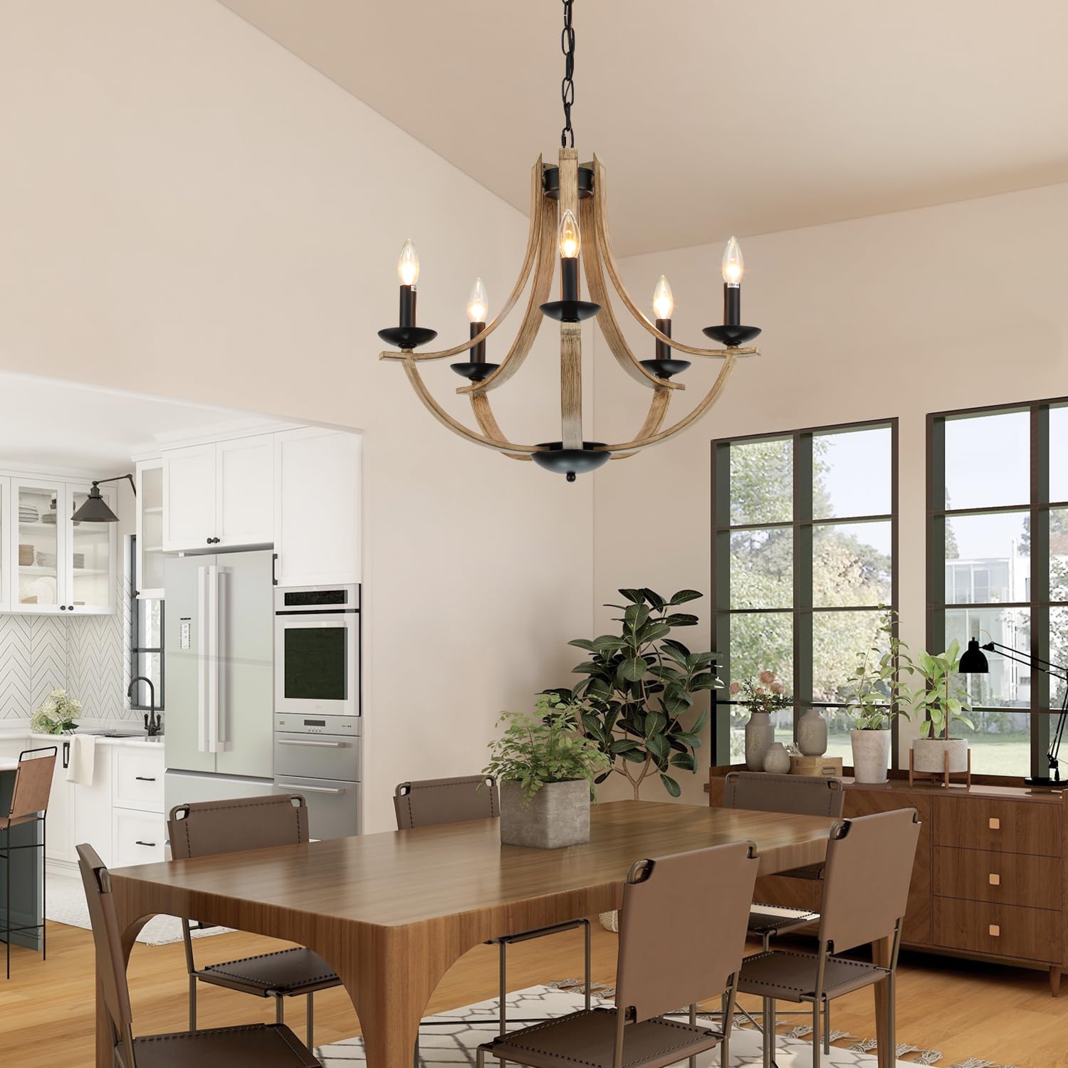 - 【Vintage Farmhouse Design】The 5-lights chandelier features a hand-brushed Faux wood grain color. Simple profiled curve profile, retro wood grain finish, so that this foyer chandelier is full of modern farmhouse. Ideal for entryway, kitchen Island, dining room, living room, bedroom, foyer etc.