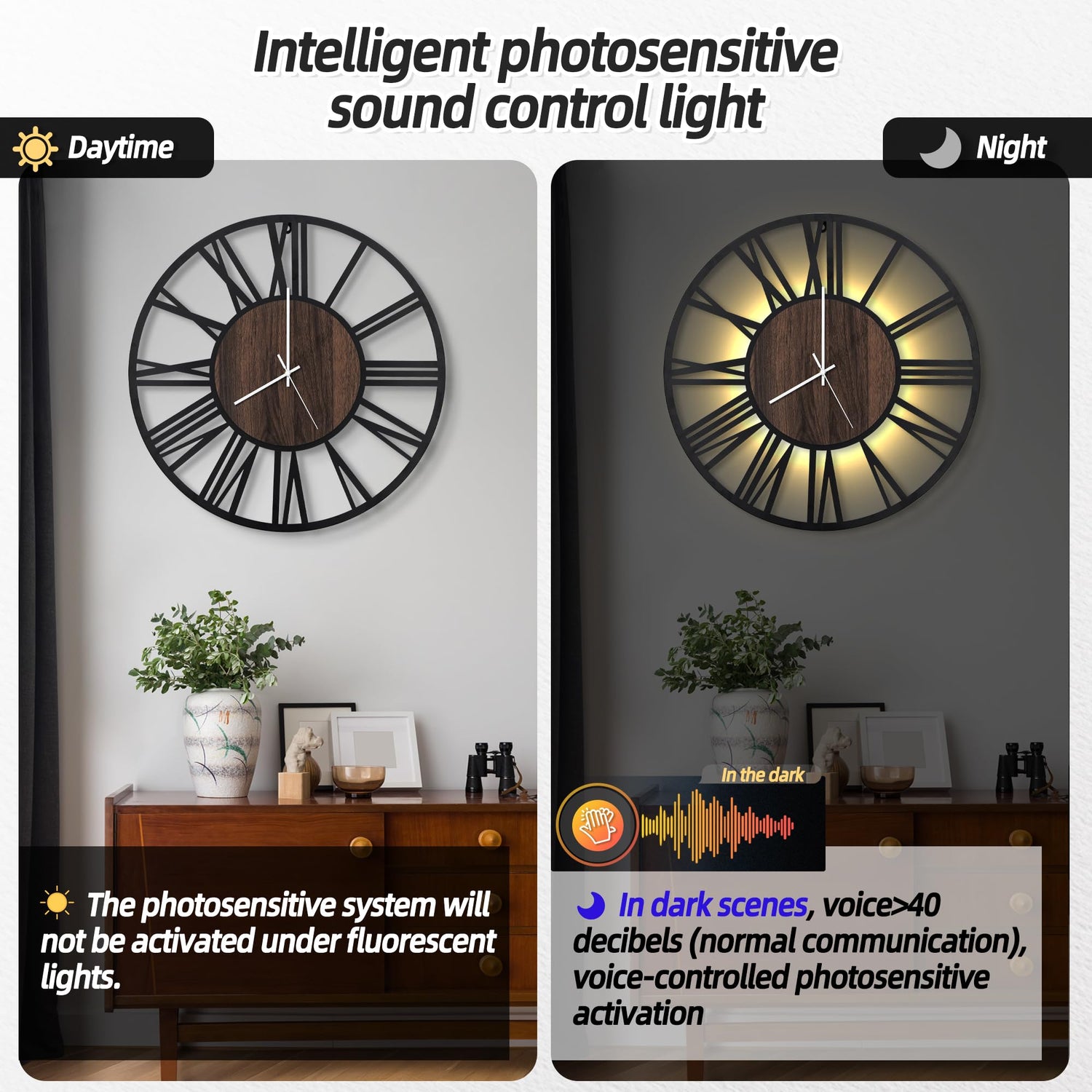 - [Long-lasting Quality with Voice-Activated Light]-Crafted from high-quality 2cm thick iron, this large black metal clock features a retro hollowed-out design and a wooden face, ensuring durability and timeless elegance. The added voice-activated light feature enhances functionality, making it perfect for nighttime use without compromising its classic aesthetic.