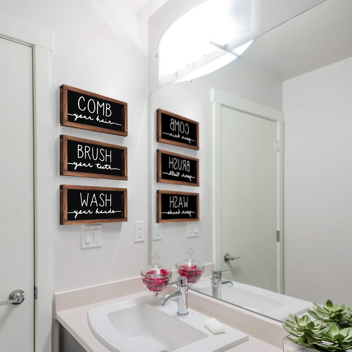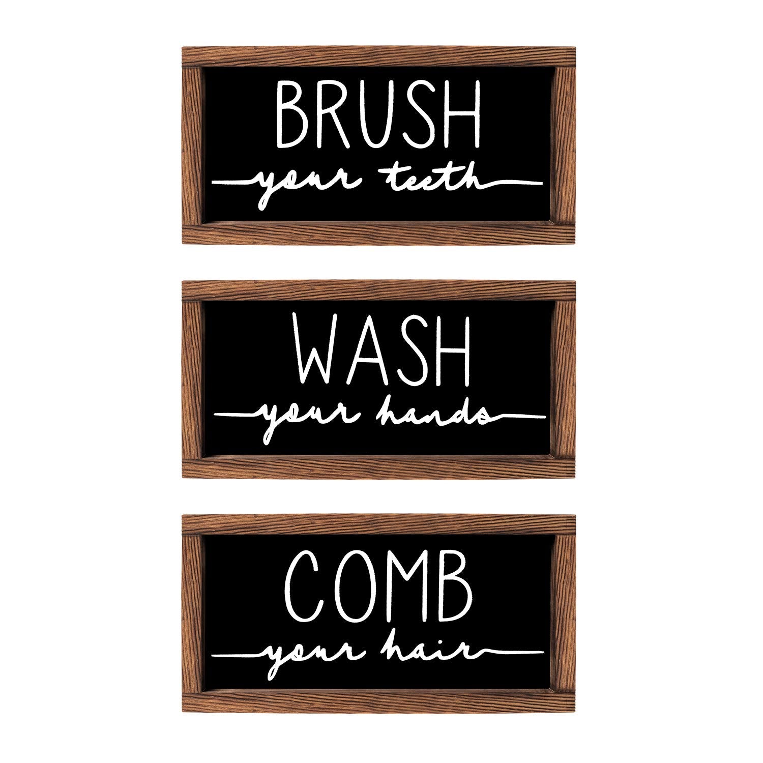 - SET OF 3 BATHROOM SIGN: One set includes 3 popular bathroom sayings plaque, each one says: "Wash Your Hands" "Brush Your Teeth" “Comb Your Hair”. hanging to display the bathroom sign together or scattered about for a fantastic look.