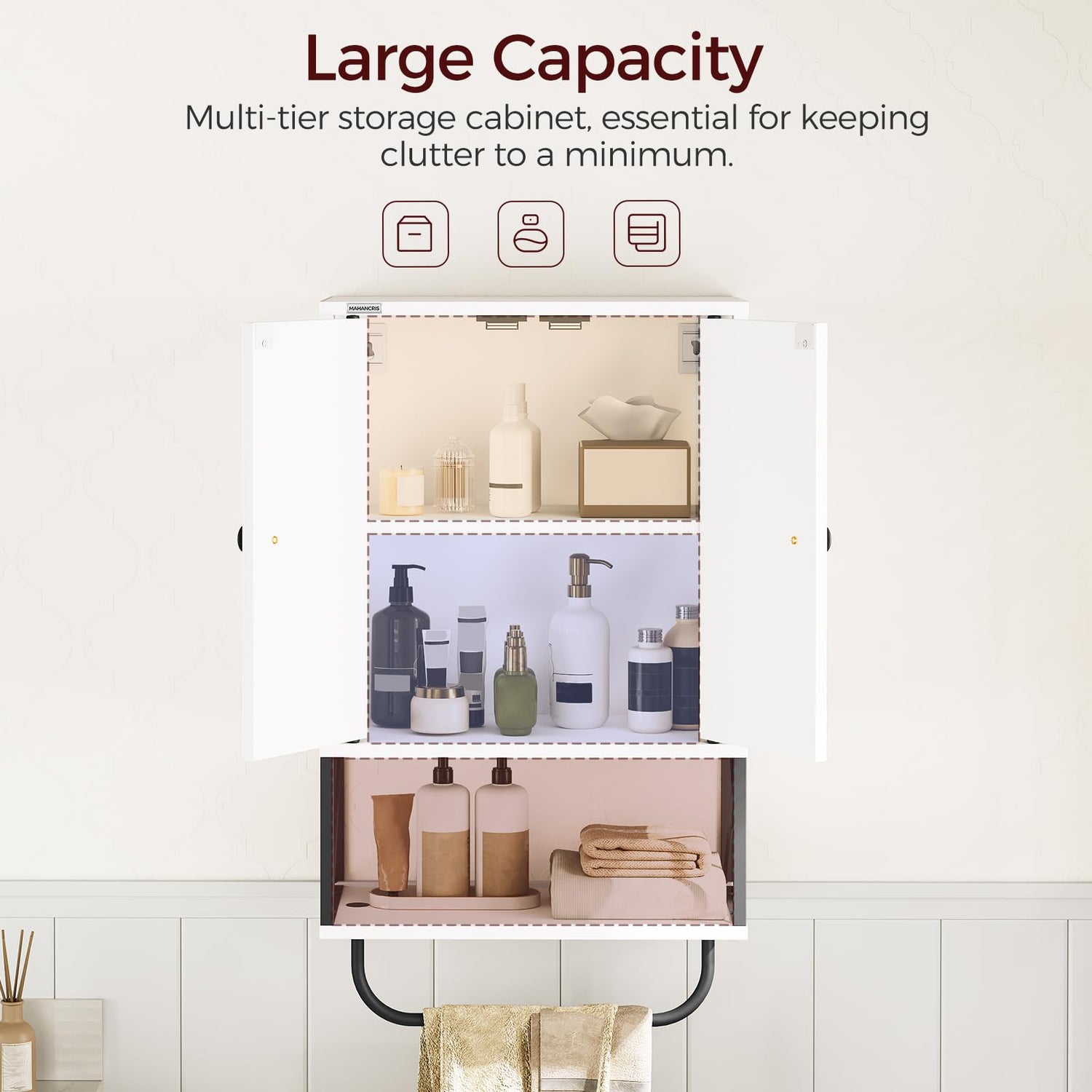 MAHANCRIS Bathroom Wall Cabinet with 2 Door and Adjustable Shelves, Farmhouse Medicine Cabinet with Towel Rack, 3-Tier Wall Mounted Storage Cabinet Over The Toilet for Bathroom Laundry Room, White