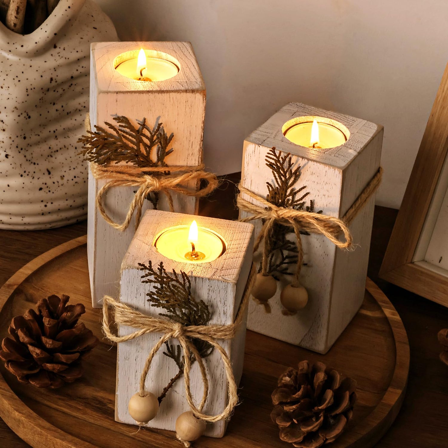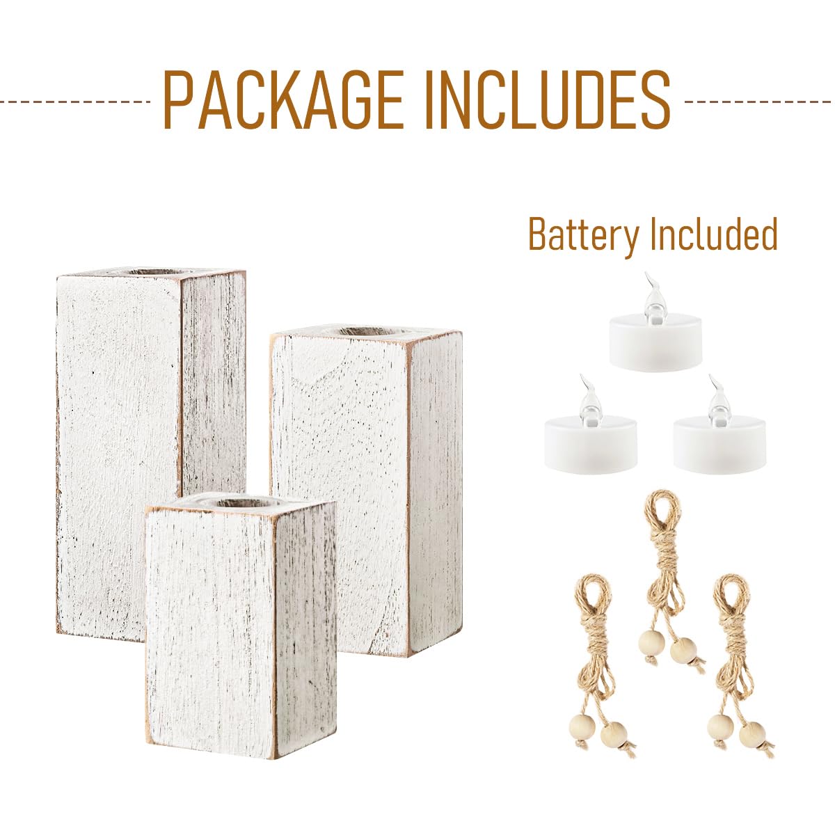 - Package Includes: You will receive 3 white wooden candle holders, each paired with a flickering LED tea light (real wax tea lights not included). The set also includes 3 hemp ropes with wooden beads and 10 button batteries. These rustic flameless candles add a cozy, farmhouse touch to your home decor, perfect for creating a warm atmosphere in any room.
