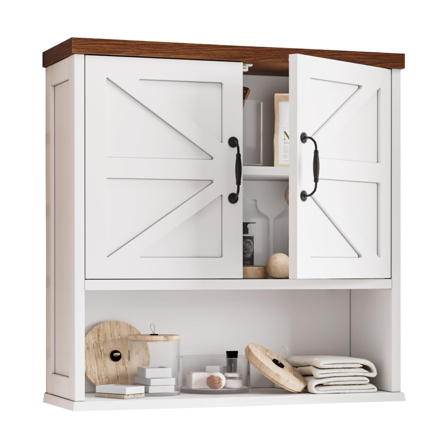 - [Bigger Space Bathroom Storage] The bathroom medicine cabinet features magnetic barn doors, adjustable shelf and open shelf, provides much storage space, it can incorporate small plants, towels, candles, wipes, tissue paper into your bathroom decor