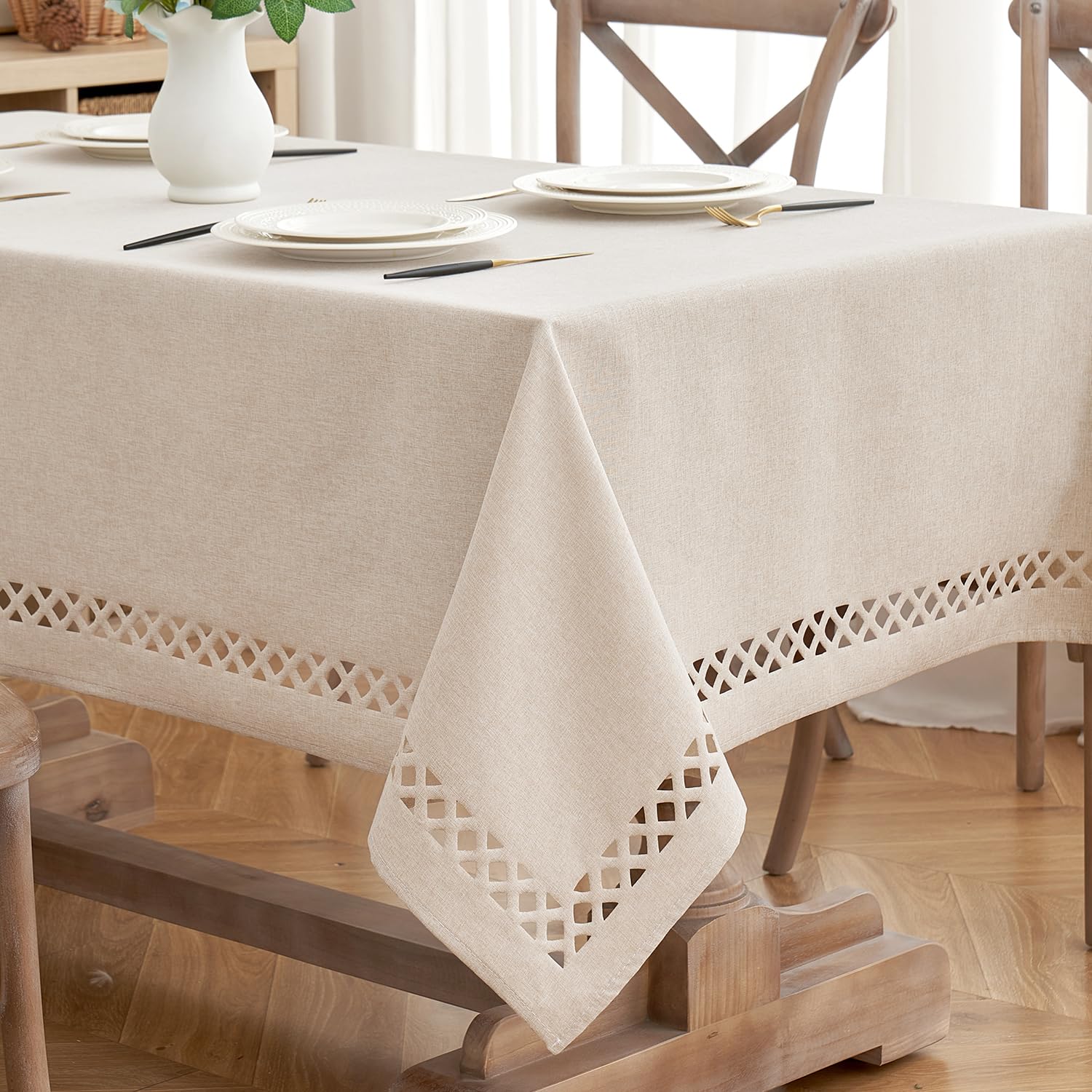 - Premium Fabric: This durable tablecloth is made of thick linen textured fabric to ensure the protection of your table and furniture. Linen-look solid fabric and fully bordered with lattice cross geometric open cutwork. Made of well treated fabric, this table cloth is durable, smooth, soft, supple, spill-proof and wrinkle-resistant.