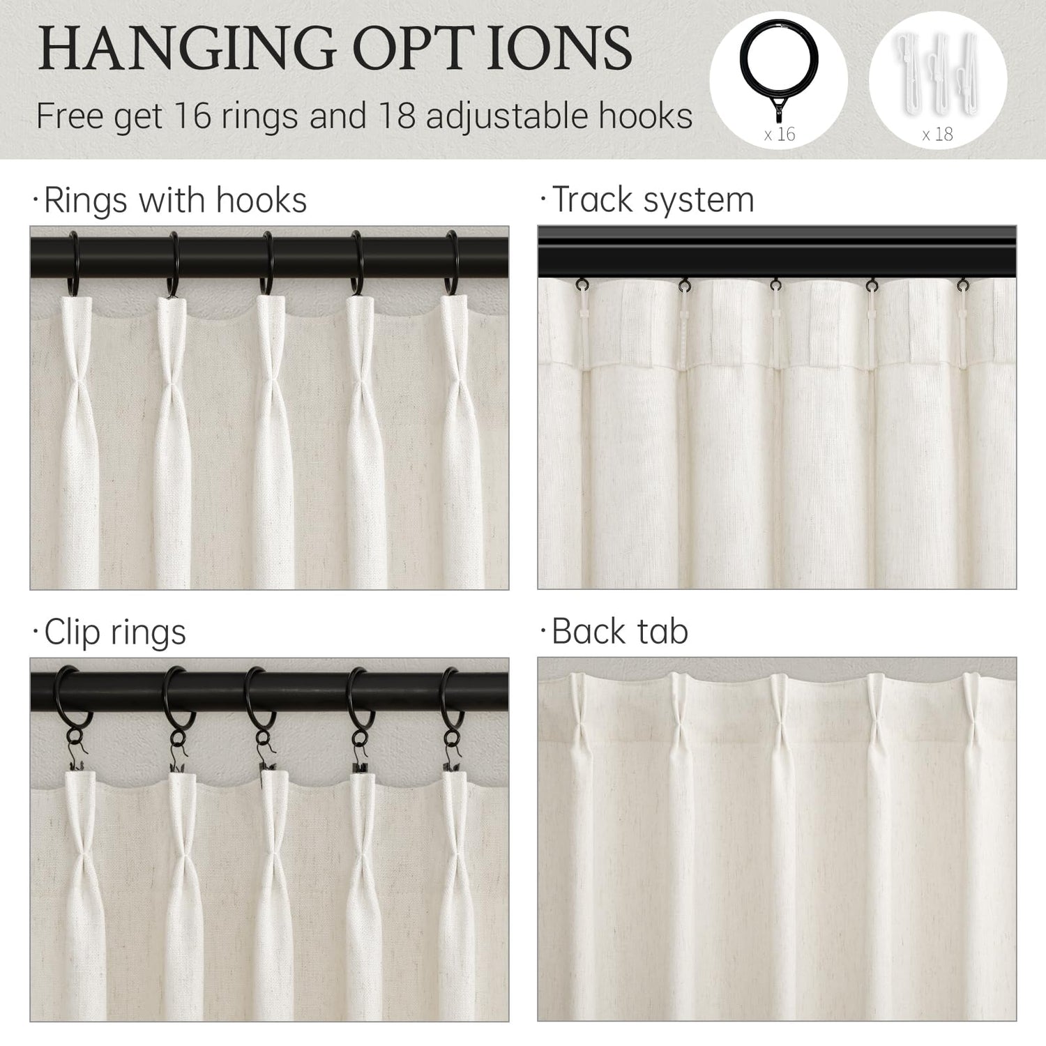 - 4 Easy Hanging Options:1.Hooks & rings for smooth glide and classic pleats 2.Back tabs for a clean, rod-hidden look 3.Track hooks for ceiling systems 4.Clip rings for a relaxed vibe.