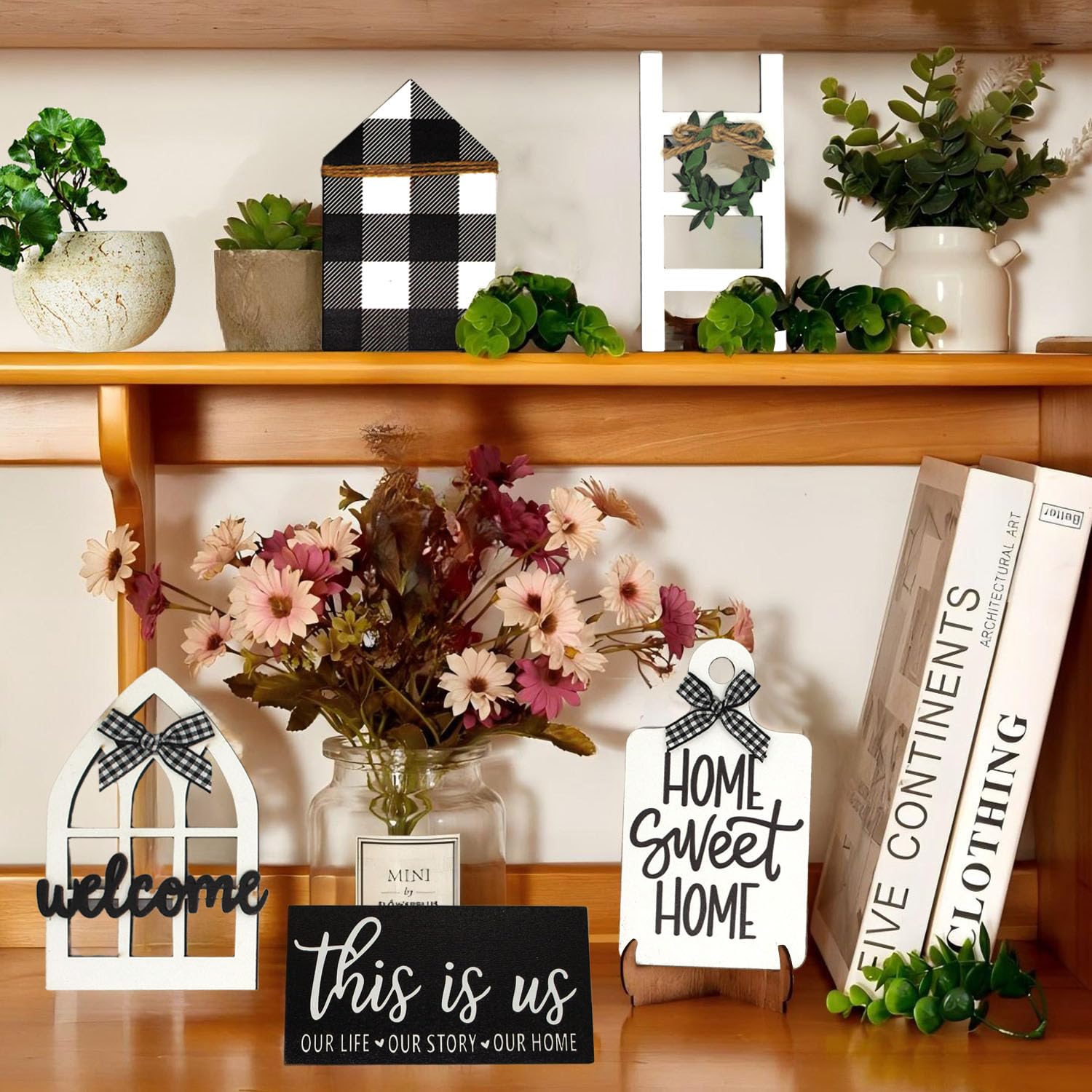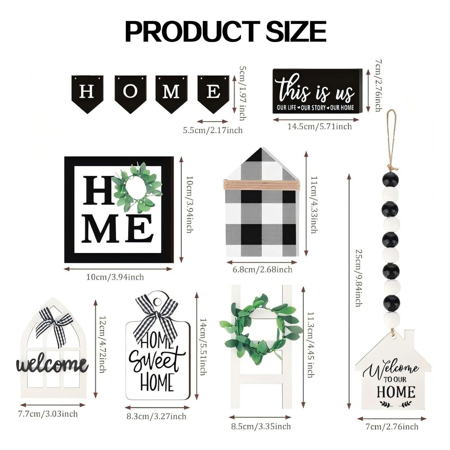 - COMPLETE 11-PIECE DECORATION PACK:A carefully curated set of 11 rustic farmhouse decorative items for adorning your tiered tray or shelf. It includes a variety of wooden mini signs, beaded garlands with tassels, artificial green plants, etc. (The tray is not included).