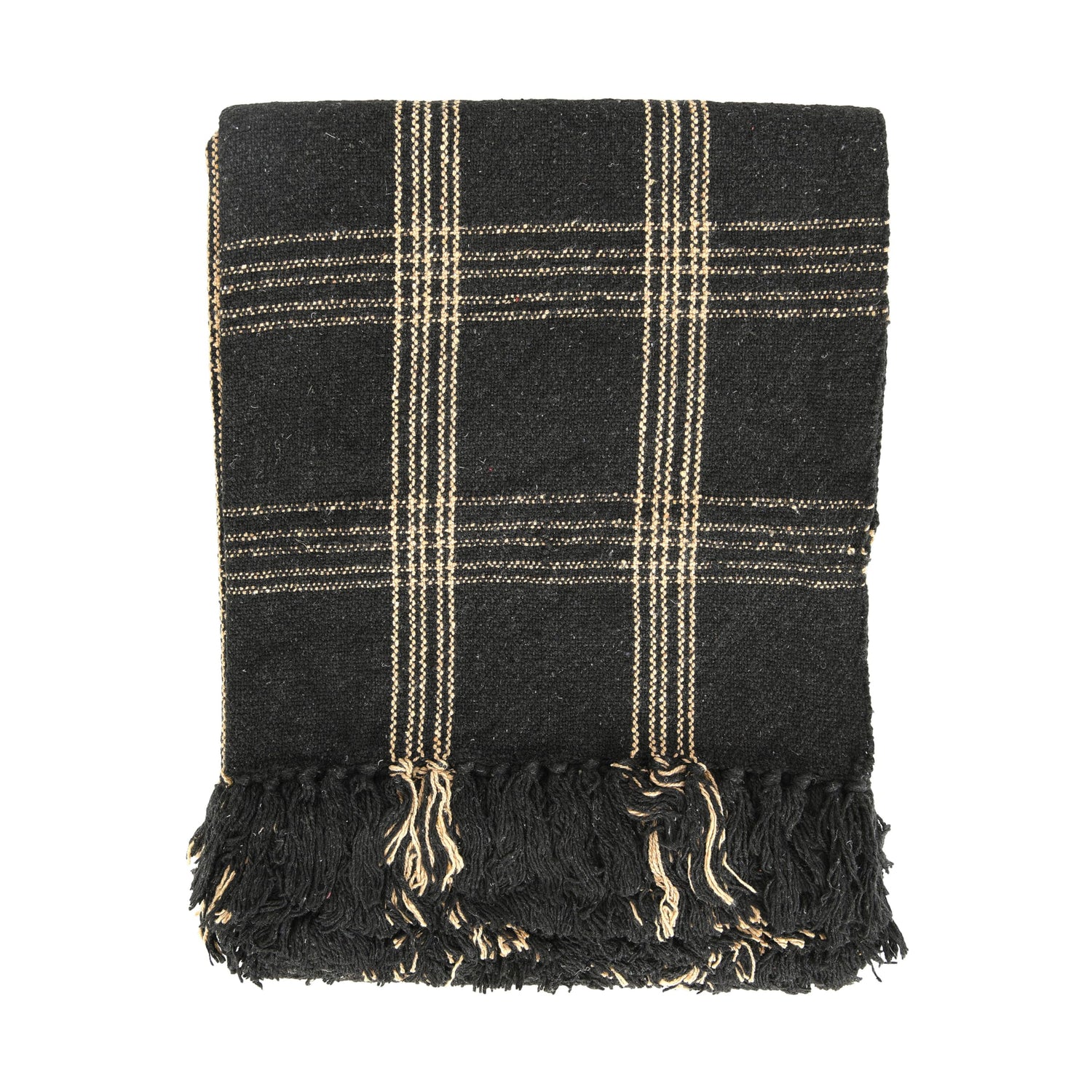 Details: Add warmth and texture to the space with this woven reclaimed cotton blend throw with a cozy and stylish design. This throw is made of a reclaimed cotton blend, a recycled and eco-friendly fabric that provides comfort and durability. The throw features a black and tan plaid pattern that adds a touch of elegance and simplicity, while the fringe trim adds a touch of charm and personality to the throw. The throw is suitable for any space needing warmth and texture, such as the living room, bedroom, office, or any other area. It can also be an excellent gift for anyone who loves farmhouse, rustic, or traditional design. This throw measures 60 inches in length and 50 inches in width and is easy to care for. Simply machine wash cold, gentle cycle. Tumble dry low. Do not bleach, iron, or dry clean. Add this woven reclaimed cotton blend throw with fringe to the home and enjoy its beauty and functionality.