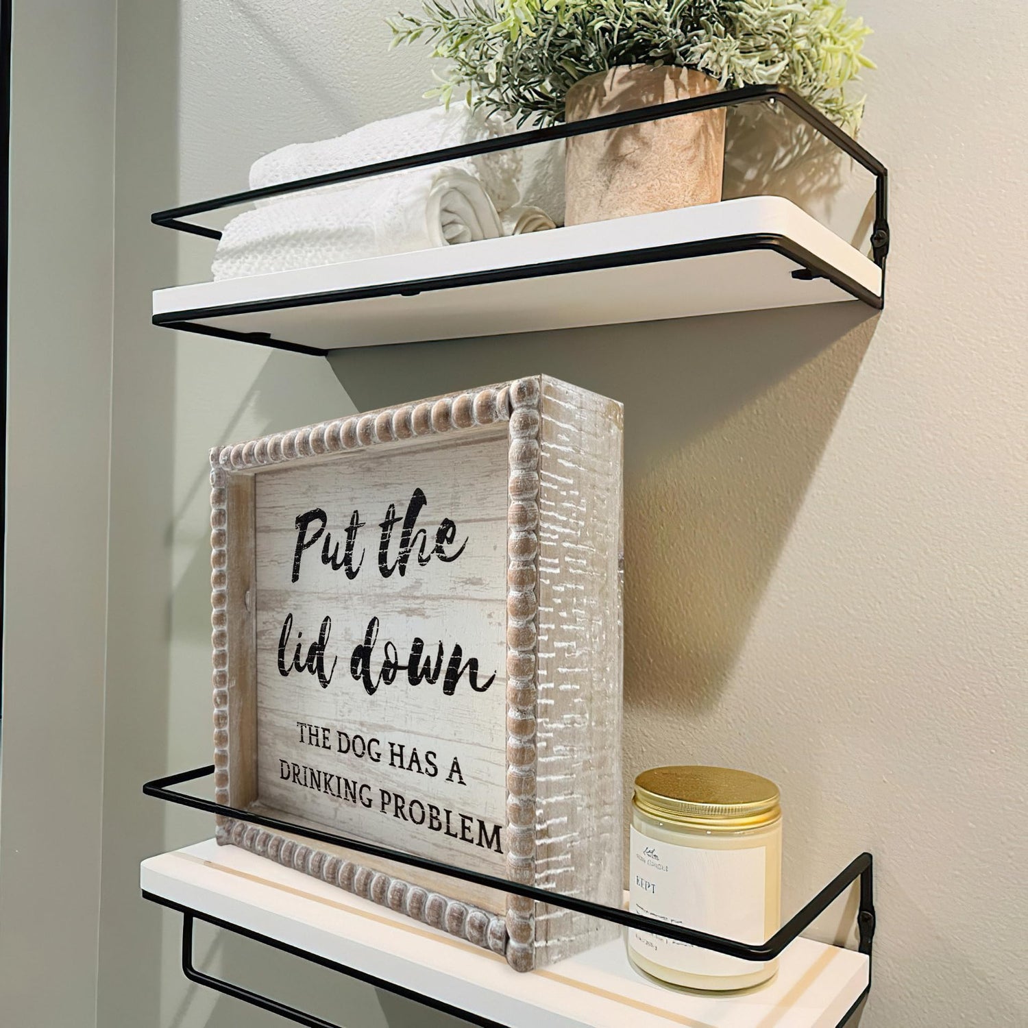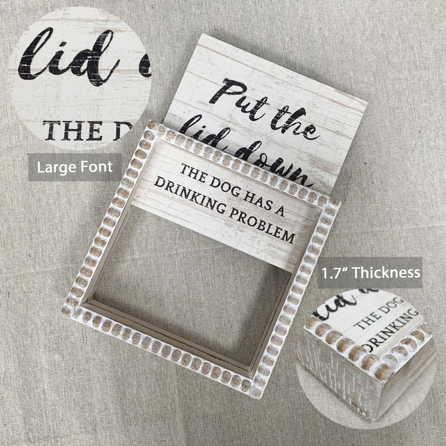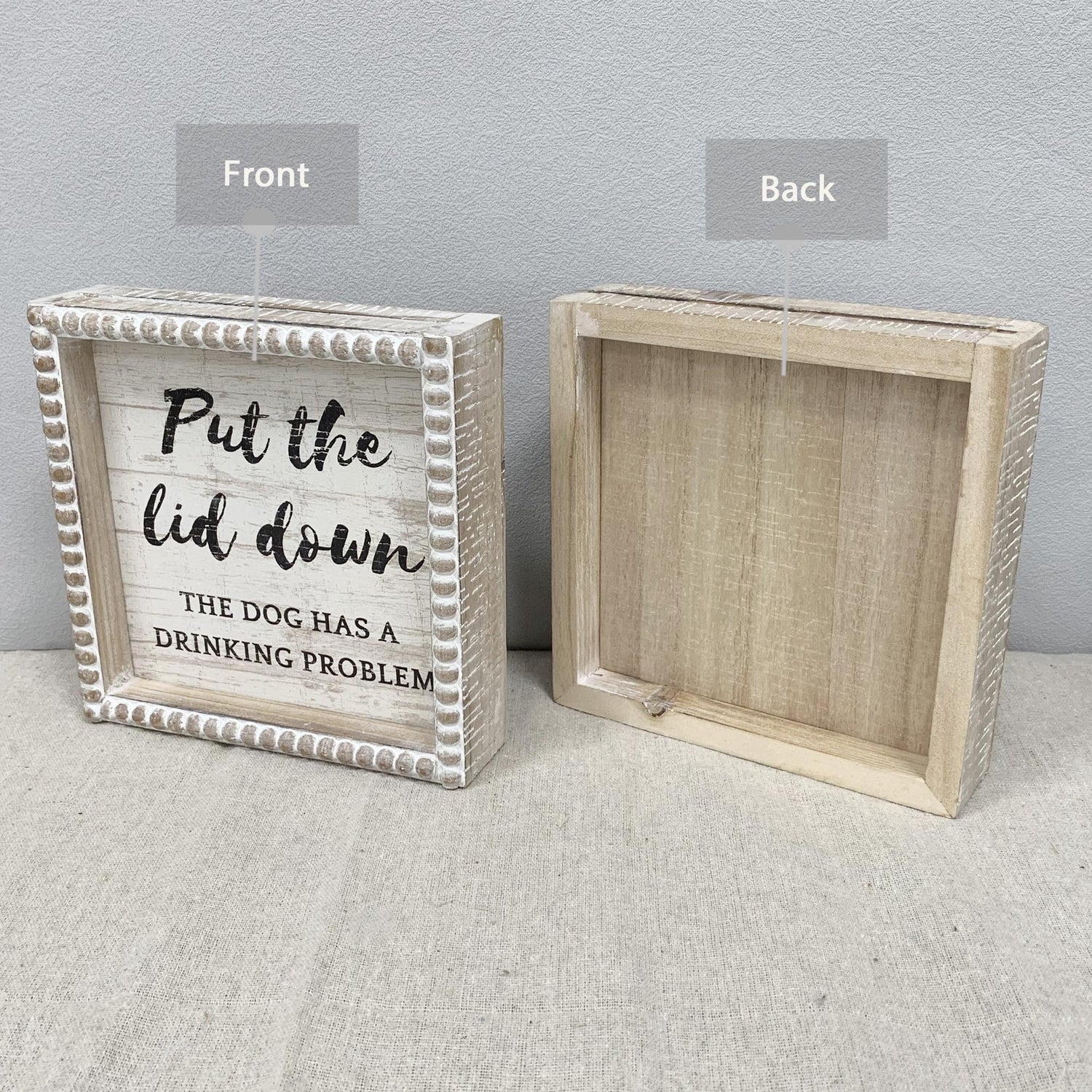Please Close the Lid the Dog Has A Drinking Problem Funny Bathroom Signs, 6.3" White Decorative Plaque Dog Home Rustic Farmhouse Bathroom Shleves Decor, Wooden Framed Small House Decorations