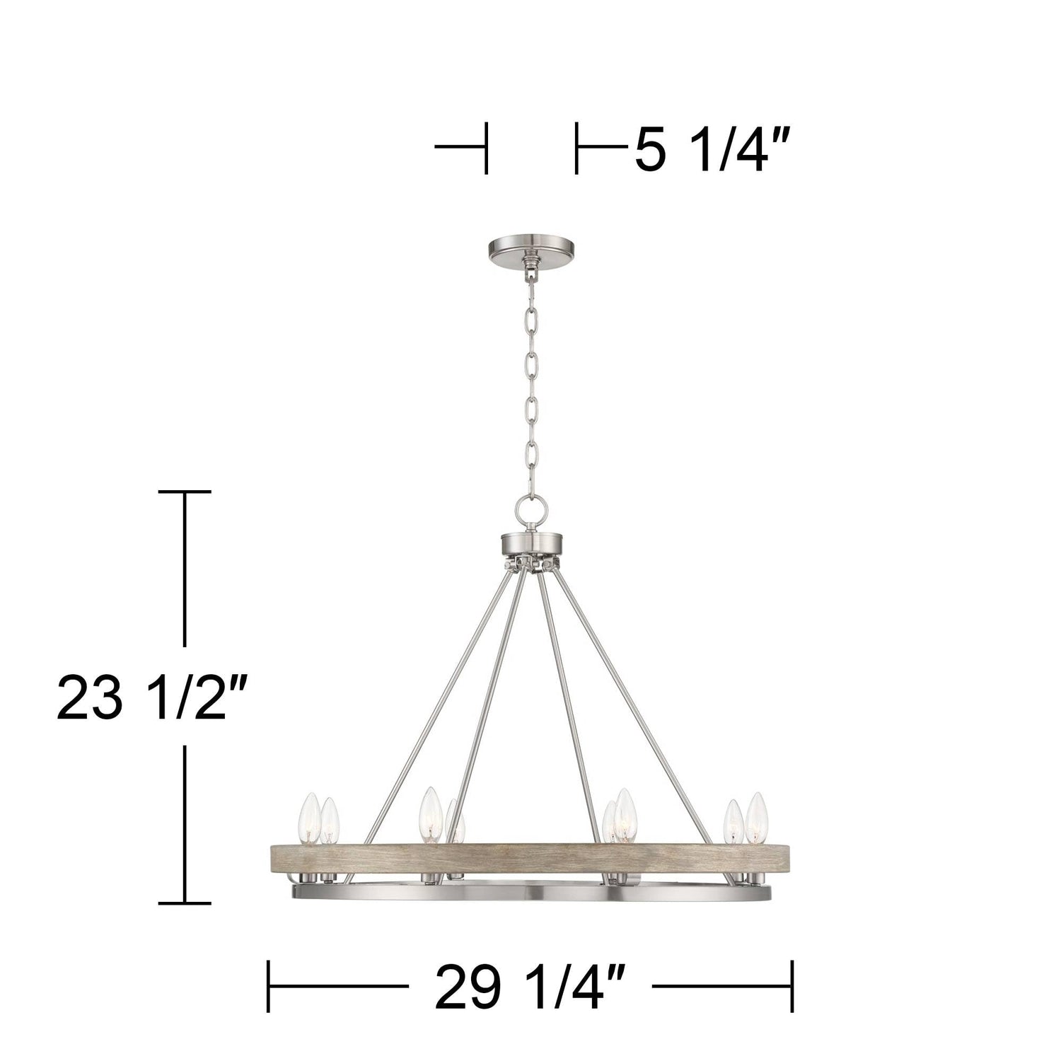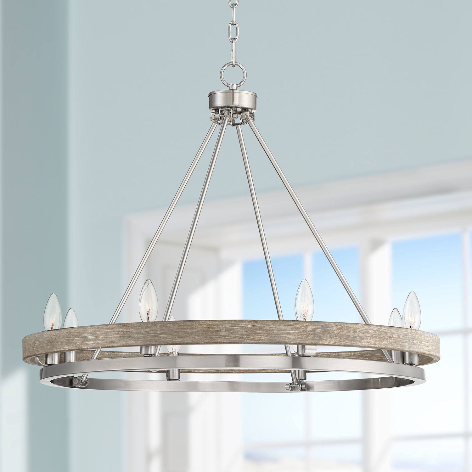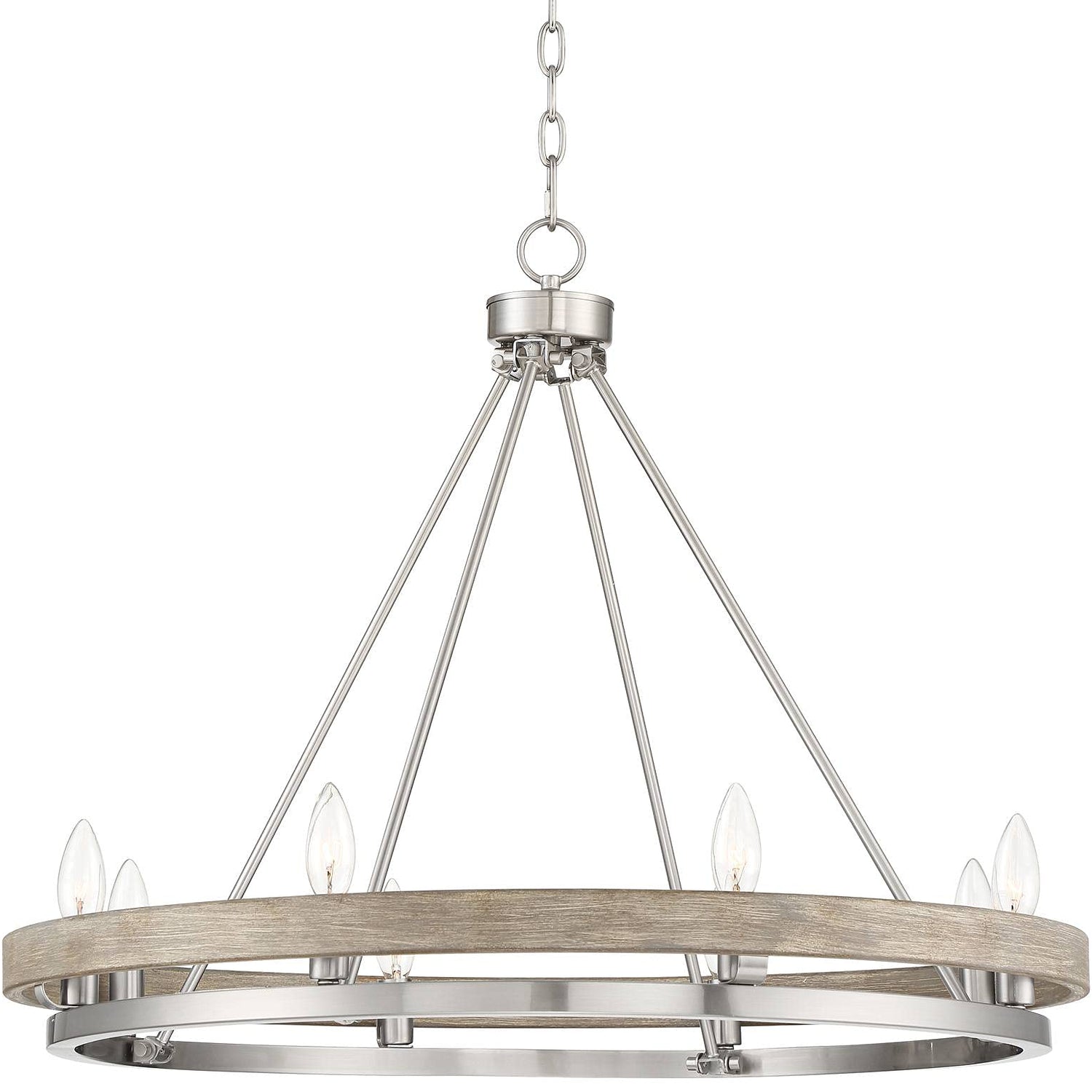 - 【Elegant Design】Eight-light wagon wheel ring chandelier. From the Possini Euro Design brand. Ideal for modern farmhouse or contemporary rooms. Gray faux wood ring. Brushed nickel finish frame and canopy. Metal construction. Open design allows the bulbs to be seen.