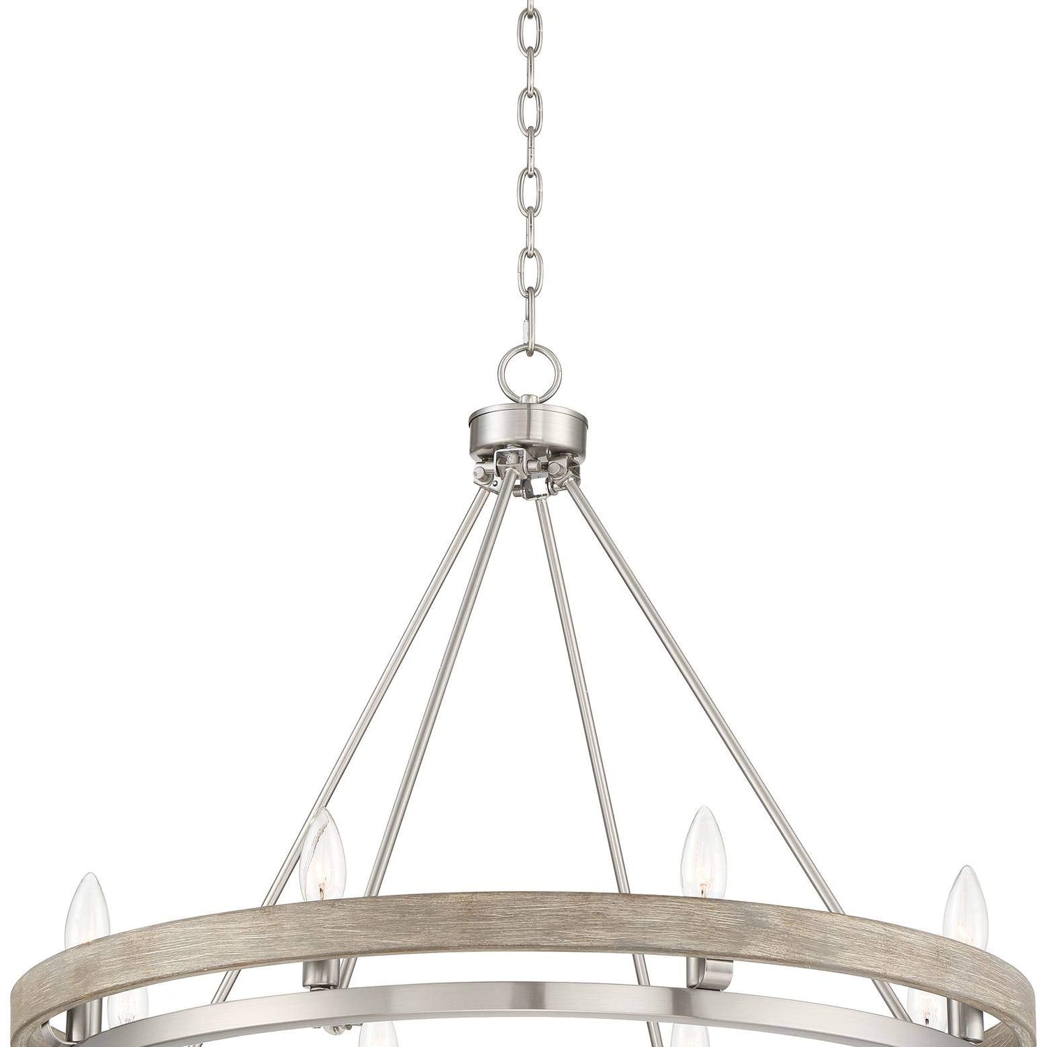 Details: Light, airy ambiance lifts the mood in a transitional space when this modern eight-light ring chandelier brightens its center. Linear design elements offer delicate, inspiring beauty to a fixture with a modern farmhouse motif. Distressed graywood finish ring accents blend with a gorgeous brushed nickel finish lower ring and suspension rods, creating an easy feel. Choose this elegant chandelier to complement a casual dining or living space.