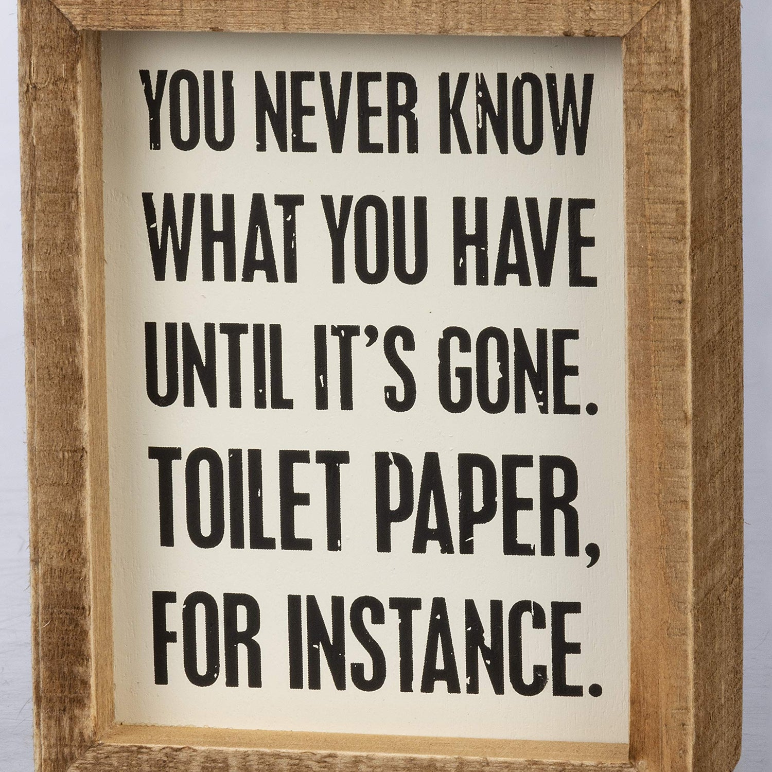 • HUMOROUS DESIGN - 'You Never Know What You Have Until It's Gone. Toilet Paper For Instance.' is a funny saying that adds a touch of humor to your bathroom or any space. This box sign is a conversation starter and will surely bring a smile to anyone who sees it.