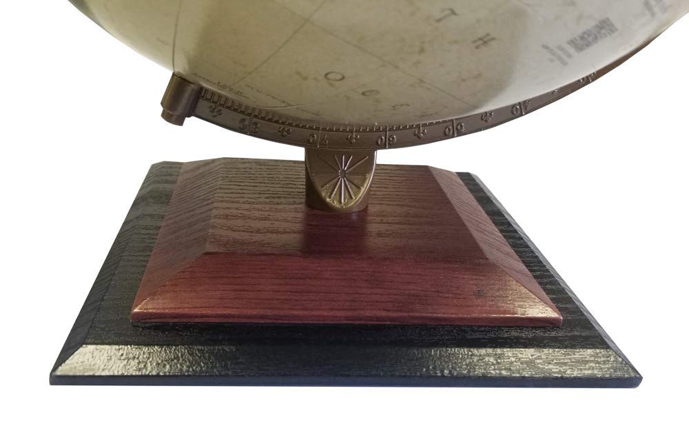 - Durable Desktop Globe: Made in the USA, the desktop globe boasts a square 7-3/4 inch two-layer base in black and cherry grain foil finish on MDF. On an antique ocean backdrop, the world map showcases shipping routes and explorer's ships.