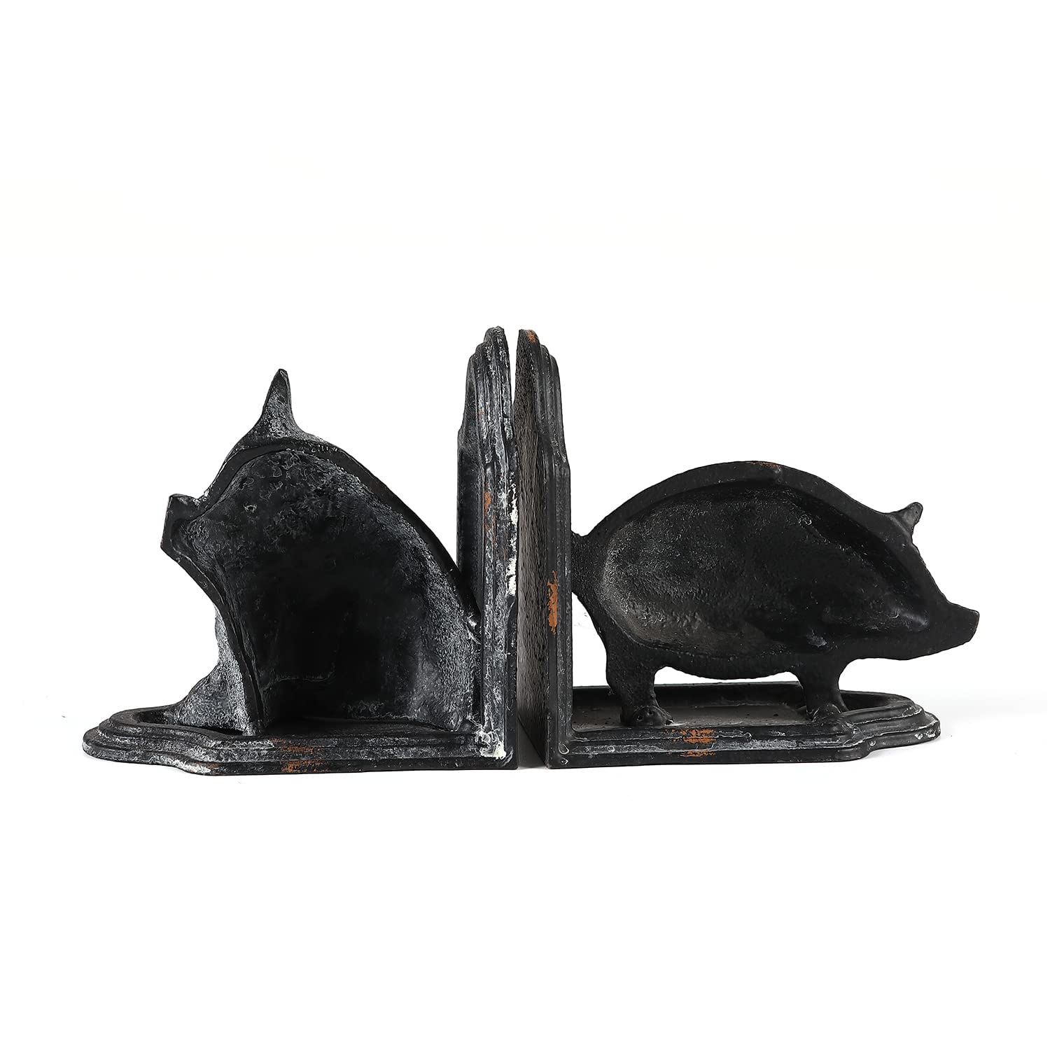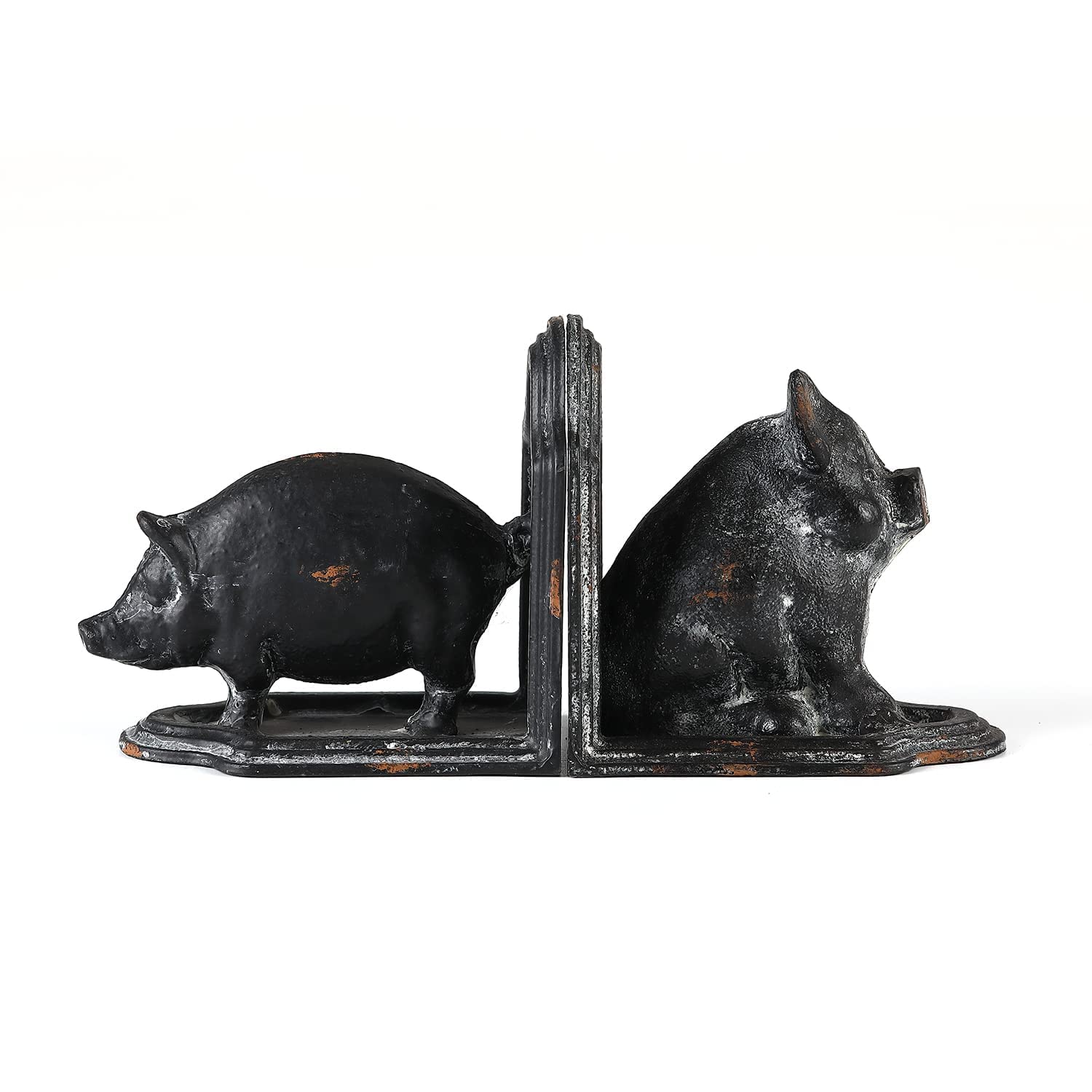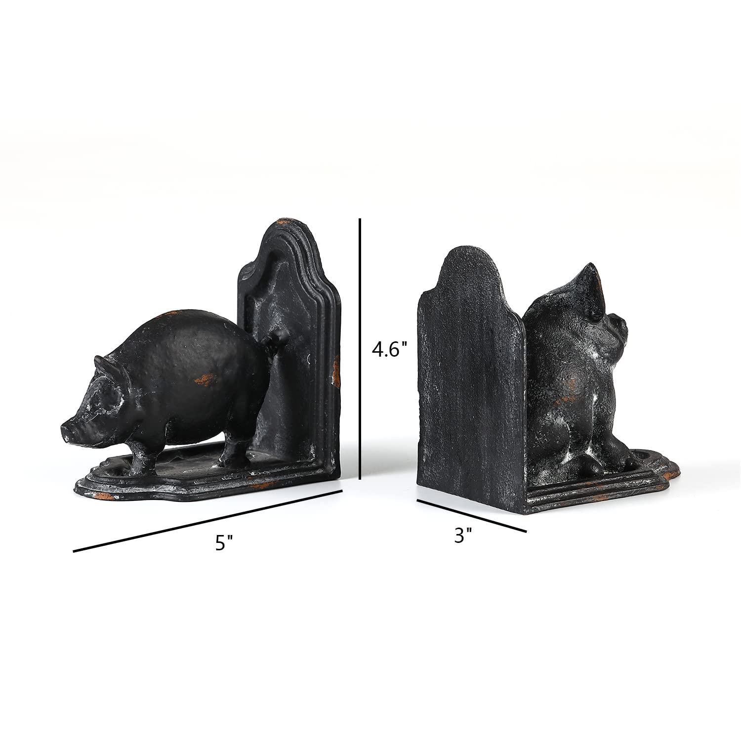 - Made from cast iron with an Old-World-inspired Gray Rustic Finish, these two pig bookends are charming and unique. Dimensions: 5" L x 3" W x 4.6" H. Weight: 1.7 lb each