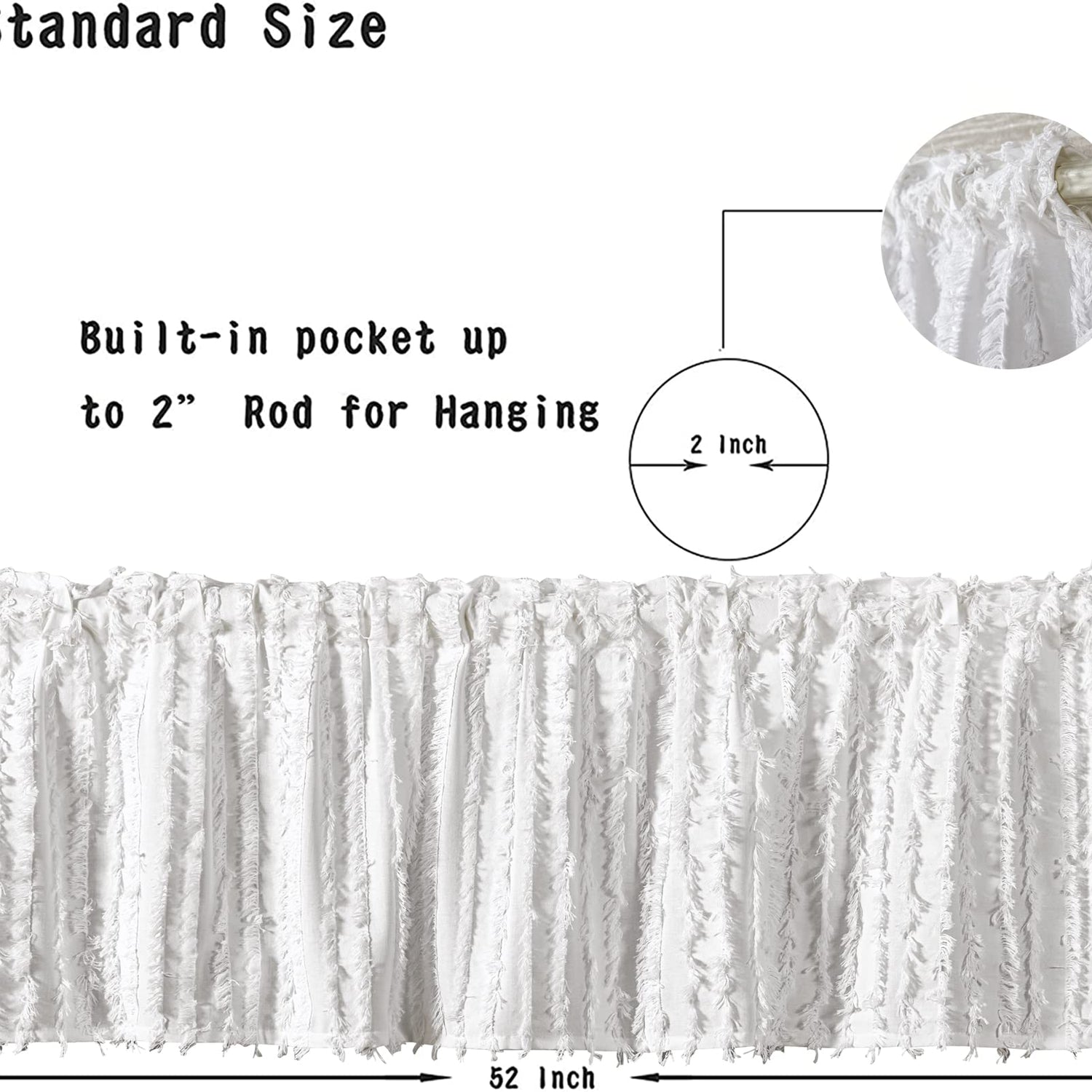 - ☻WHITE WINDOW VALANCE 18 INCH LENGTH☻ -- This boho farmhouse valance curtain measures 18" length x 52" width, constructed with 2" header and 3" rod pocket, perfect be hung from a standard basic or decorative curtain rod / pole.