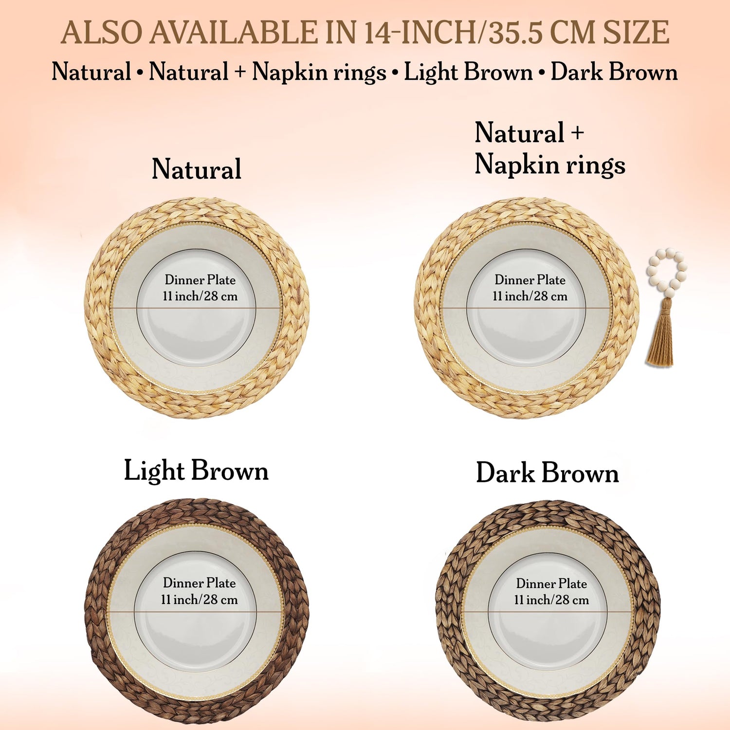 - 4️⃣ Perfect Fit for Everyday & Special Moments Sized at 15 inches to suit standard dinner plates and chargers. Ideal for casual dining, outdoor meals, or decorating a rustic-themed table.