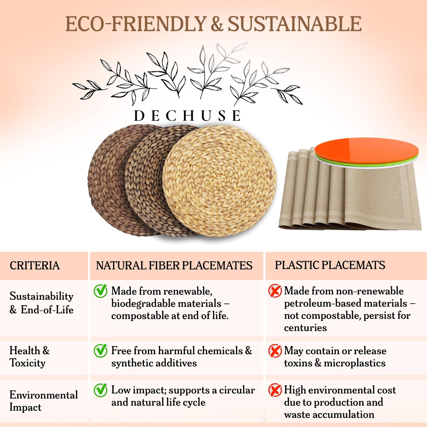 - 1️⃣ Handwoven Natural Beauty Each placemat is artisan-crafted from 100% natural water hyacinth, offering a soft, organic texture that elevates your boho, farmhouse, or coastal dining decor. A perfect mix of style and sustainability.