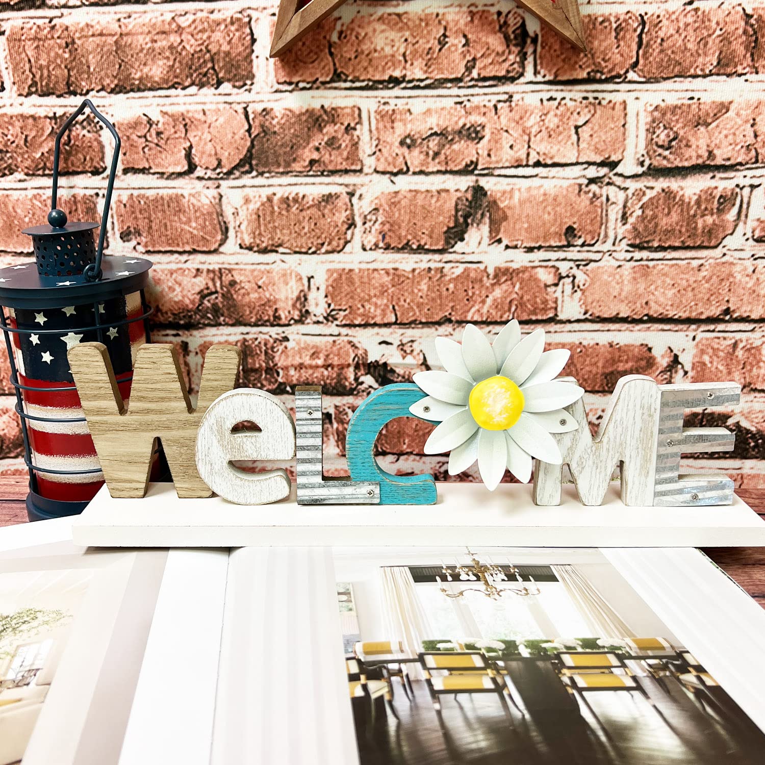 - WOOD WELCOME LETTERS DAISY STANDING TABLE SIGN-The wood daisy table top decor WELCOME letter sign is made of premium MDF sturdy and durable enough! Measures 14.75''Lx2.25''Wx3.75''H,excellent decor for home and fit your rustic furniture style.