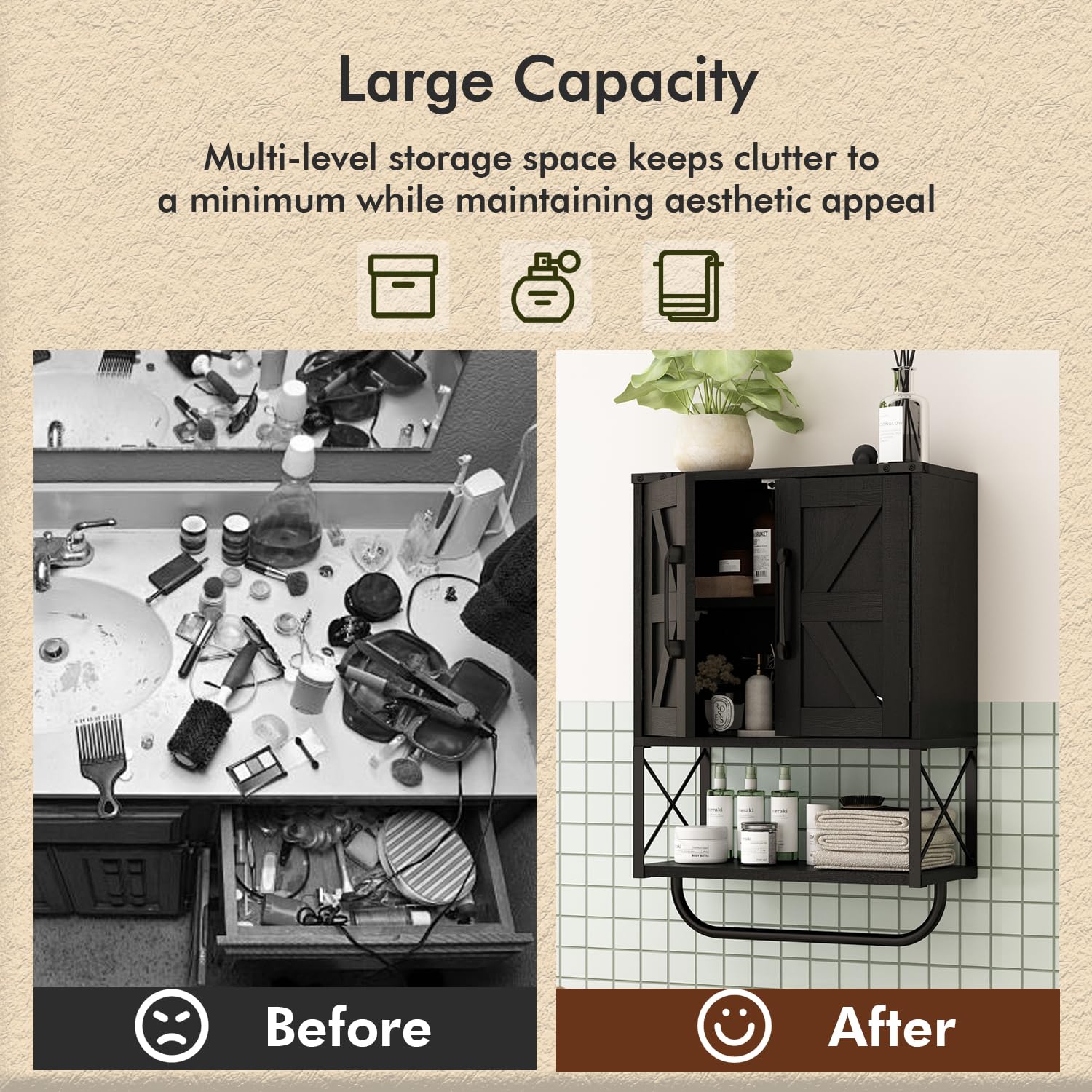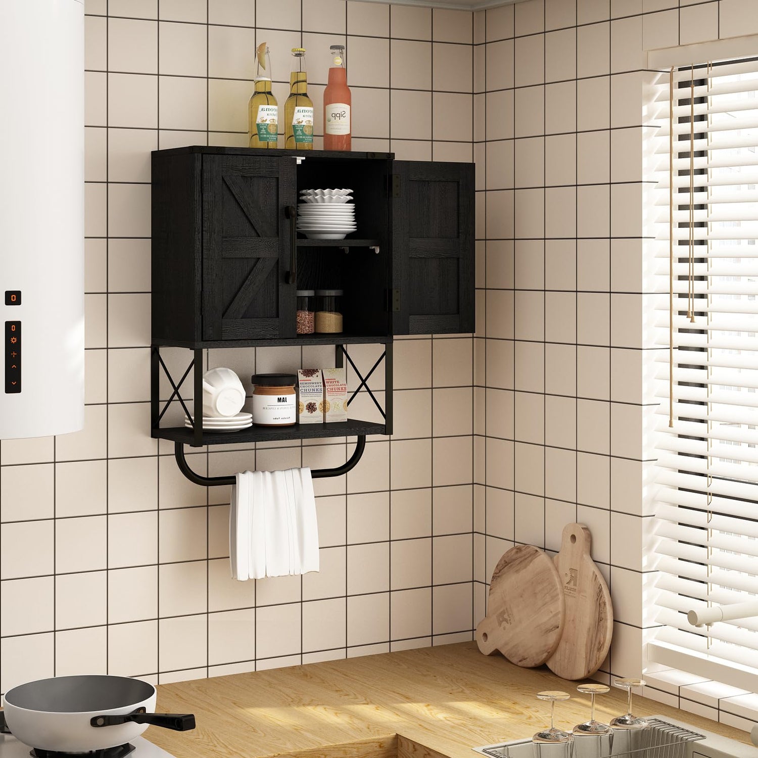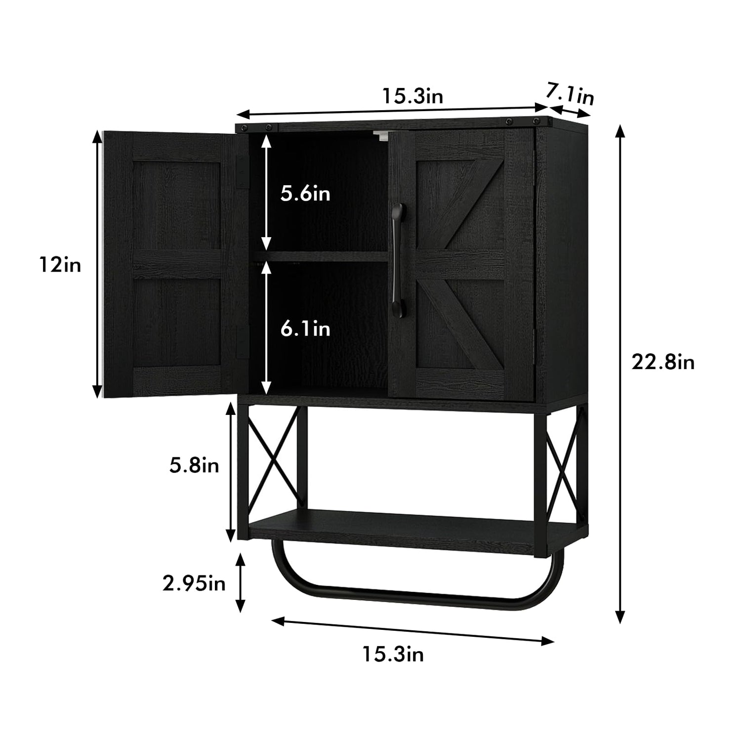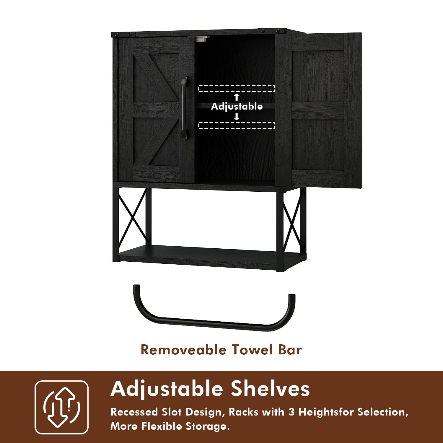RUSTOWN Farmhouse Rustic Medicine Cabinet with Two Barn Door,Wood Wall Mounted Storage Cabinet with Adjustable Shelf and Towel Bar, 3-Tier Cabinet for Bathroom, Living Room(Black)