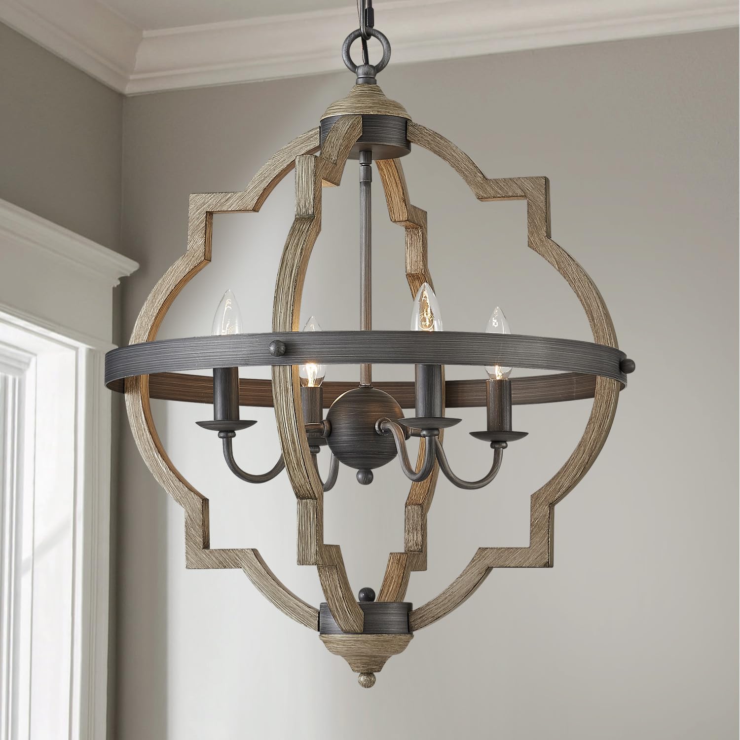 - The Rustic vintage-industrial style globe chandelier with wooden finish is perfectly used for living room, dining room, farmhouse, restaurant, entryway, bar, corridor, workshop, hallway, foyer and any other dry place.