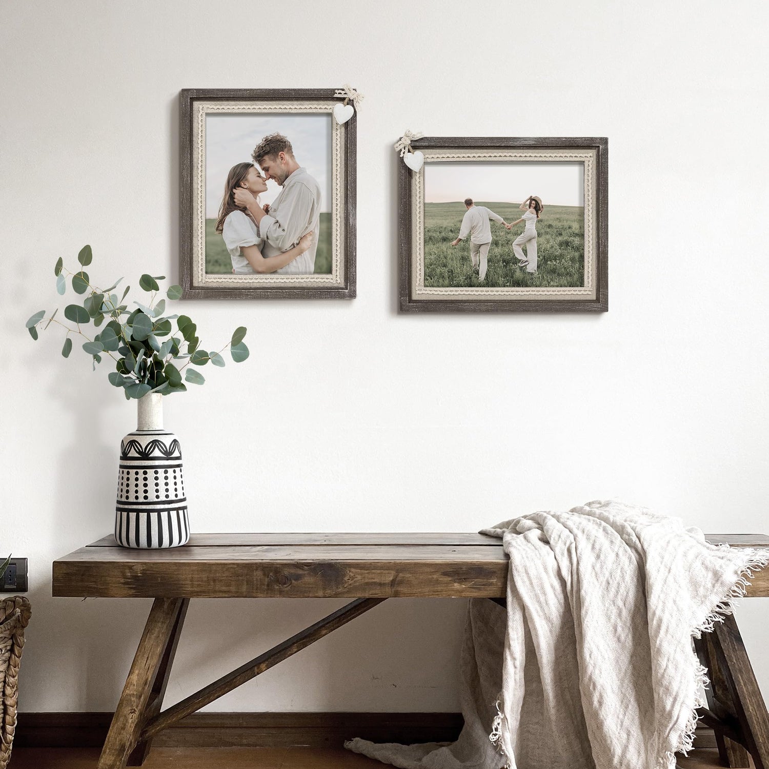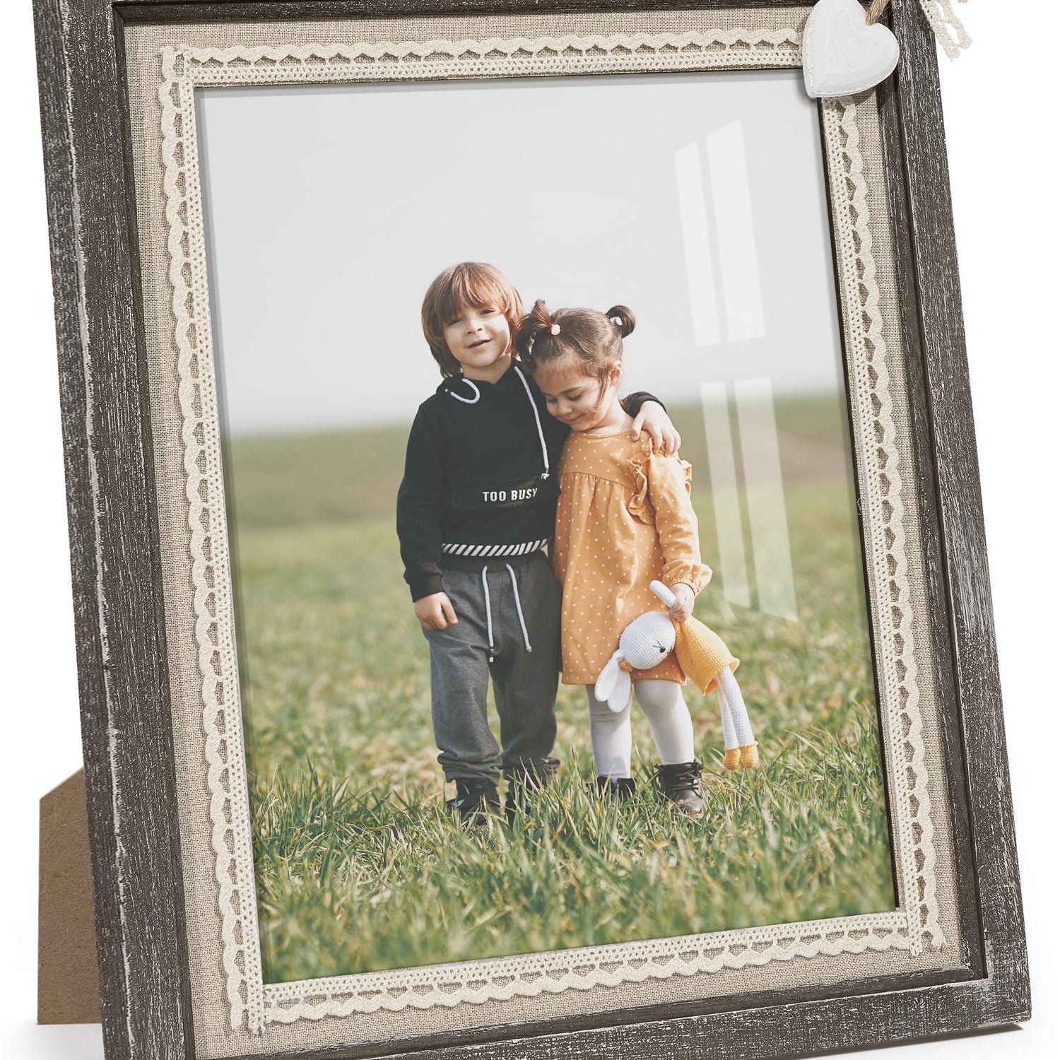Sapowerntus 8x10 Picture Frames Rustic Wood Farmhouse Cute Heart Love Solid Wooden Family Photo Frame Lace Bow Glass Boho Wall Decor Hanging Tabletop Kids Mom Mother Wedding Gift