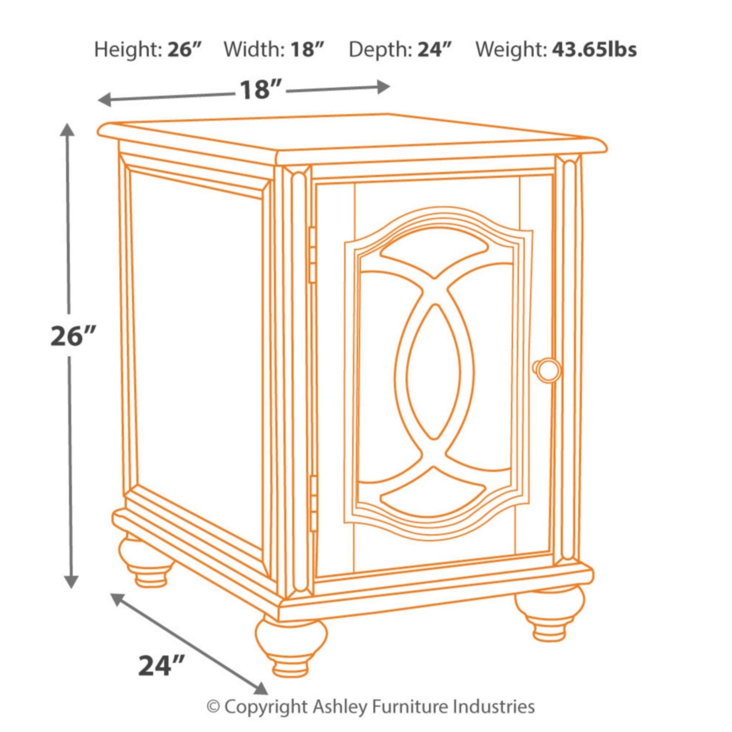 - CHAIR SIDE END TABLE: Cottage lovers, rejoice—this table serves up style with a chipped white finish and inset mirror on the door that exudes pure elegance. You'll enjoy its shapely, refined form