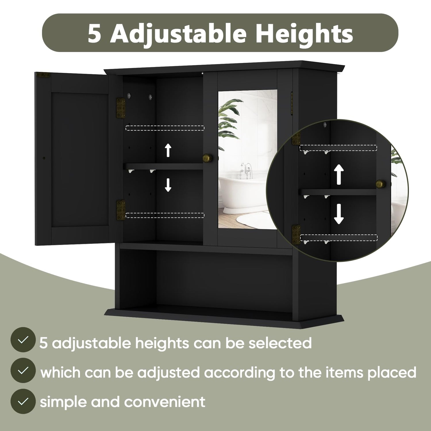 - 【Multi-Function】This bathroom wall cabinet with mirrors has a hidden shelf and an open shelf. You can use these mirrors to shave or apply make-up with ease. Inside, the adjustable shelves can be adjusted to 5 heights to meet your large storage needs. The closed storage behind the door keeps your items clean and dry while protecting your privacy. Underneath the cabinets are open shelves that can be used to hold items or decorations.