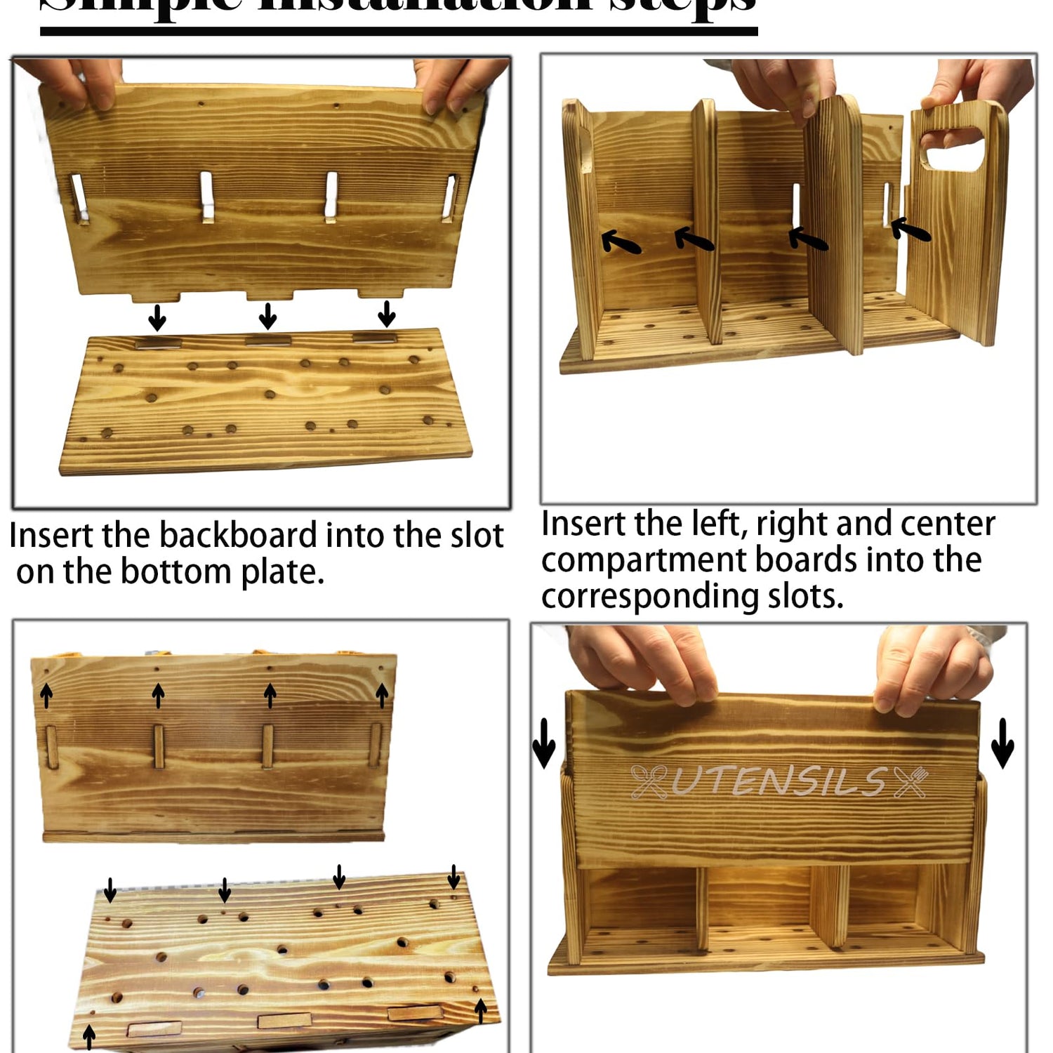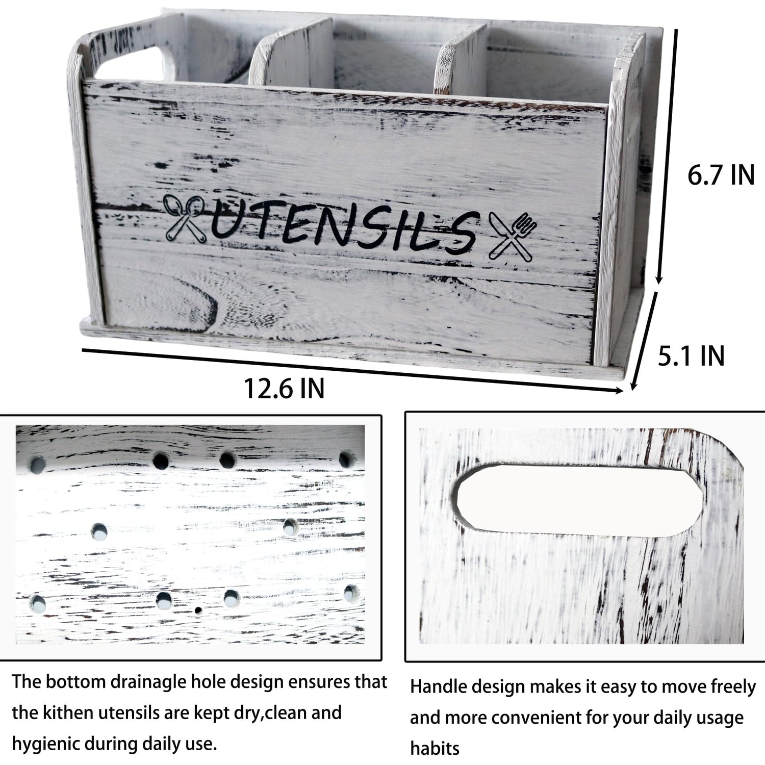 - 【Easy Installation and Excenllent Quality】Installation can be easily completed according to the instructions. The flexible design of internal partitions can be easily adjusted according to your needs, achieving customized space and allowing you to enjoy the fun of the installation process. Very well-made and stylish,very durable.This utensil holder is made of pine wood and has a rustic farmhouse style.It not only optimizes kitchen storage space well, but also decorates your kitchen well.