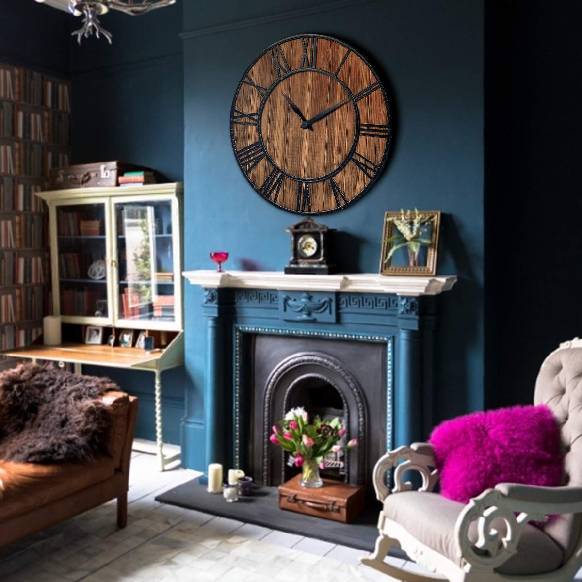 Details: Description: Do you think your wall clock is too ordinary and lacks uniqueness? You can enjoy every minute with our round wall clock.The panel is made of solid thick fir and the metal frame and Roman numerals is durable for long service time. You only need an AA battery to start the clock, which is very convenient. This wall clock can be easily hung where you like on the wall and the strips at back play a supporting and reinforcing role. This wall clock has a retro and rustic style that perfectly matches your other decor to create beauty in your home.Features:Rustic thick wood panel for durability12 metal roman numbers add retro and unique feelingLarge sized wall clock for clearly reading time in any anglesOnly an AA battery is needed (not included)Durable quartz movement can work longerThe precise metal hour and minute hands tell the time exactly No assembly needed, just open the package and hang it on the wallSuitable for living room, bedroom, office, coffee bar and so onSpecifications:Color: Natural WoodMaterial: FirOverall size: 30” X 30” X 1” (L XW XH)Movement type: QuartzBattery type: 1 AA Carbon battery (not included)Package includes:1 x Wall Clock1 x User Manual
