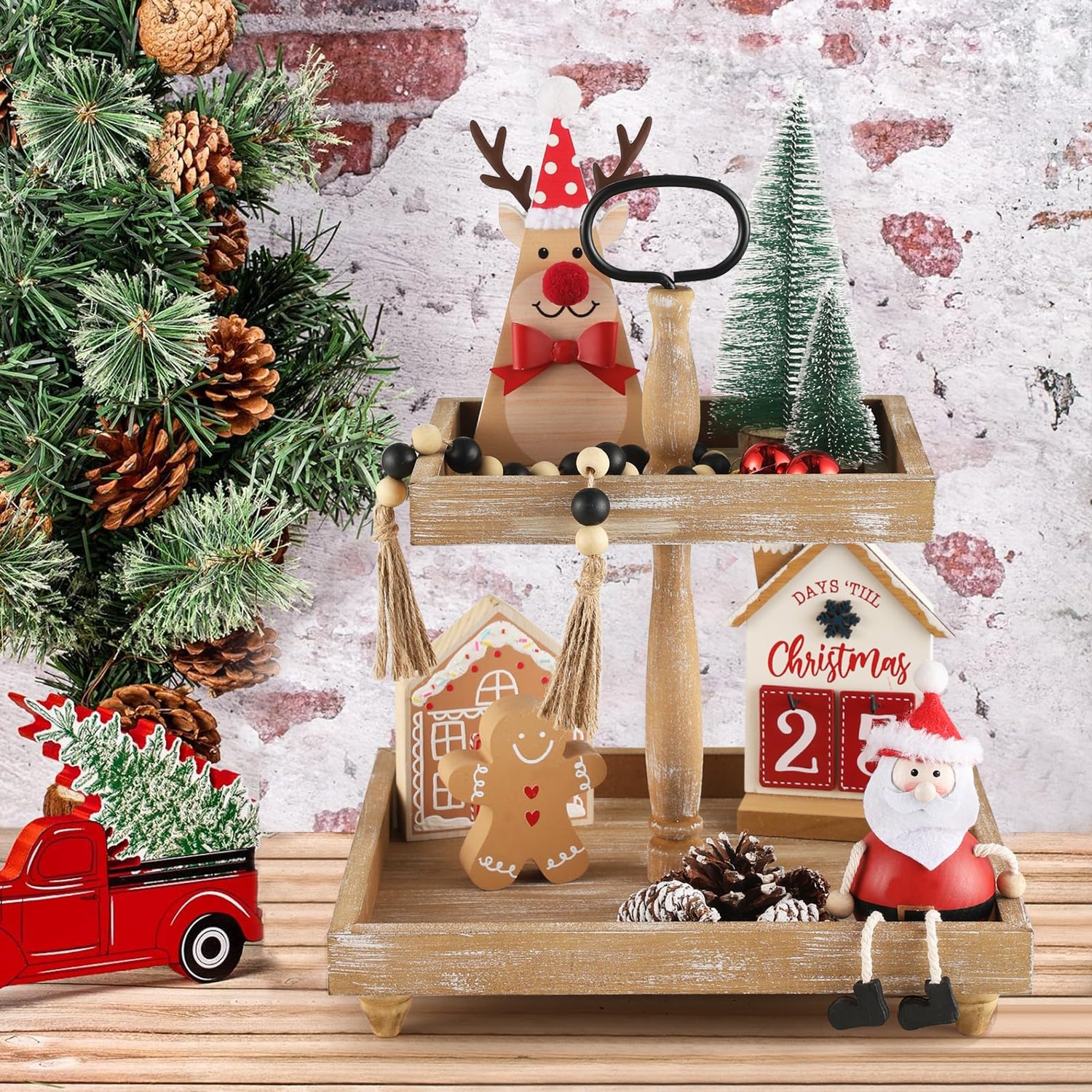 Tiered Tray Stand, Rustic Wooden 2 Tier Decorative Tray with Bead Garland, Farmhouse Square Wood Serving Tray Counter Centerpiece for Coffee Bar Home Decor Thanksgiving Housewarming Gifts (Brown)