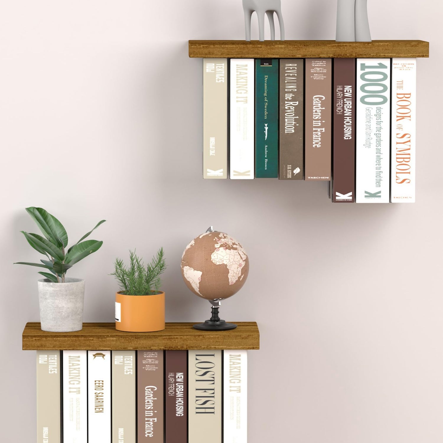 Tohiasen Floating Book Shelves for Wall Mounted Set of 2, Wood Hanging Bookshelf, Book Display Shelf for Wall, Unique Space Saving Book Shelf Wall Book Holder (Brown)