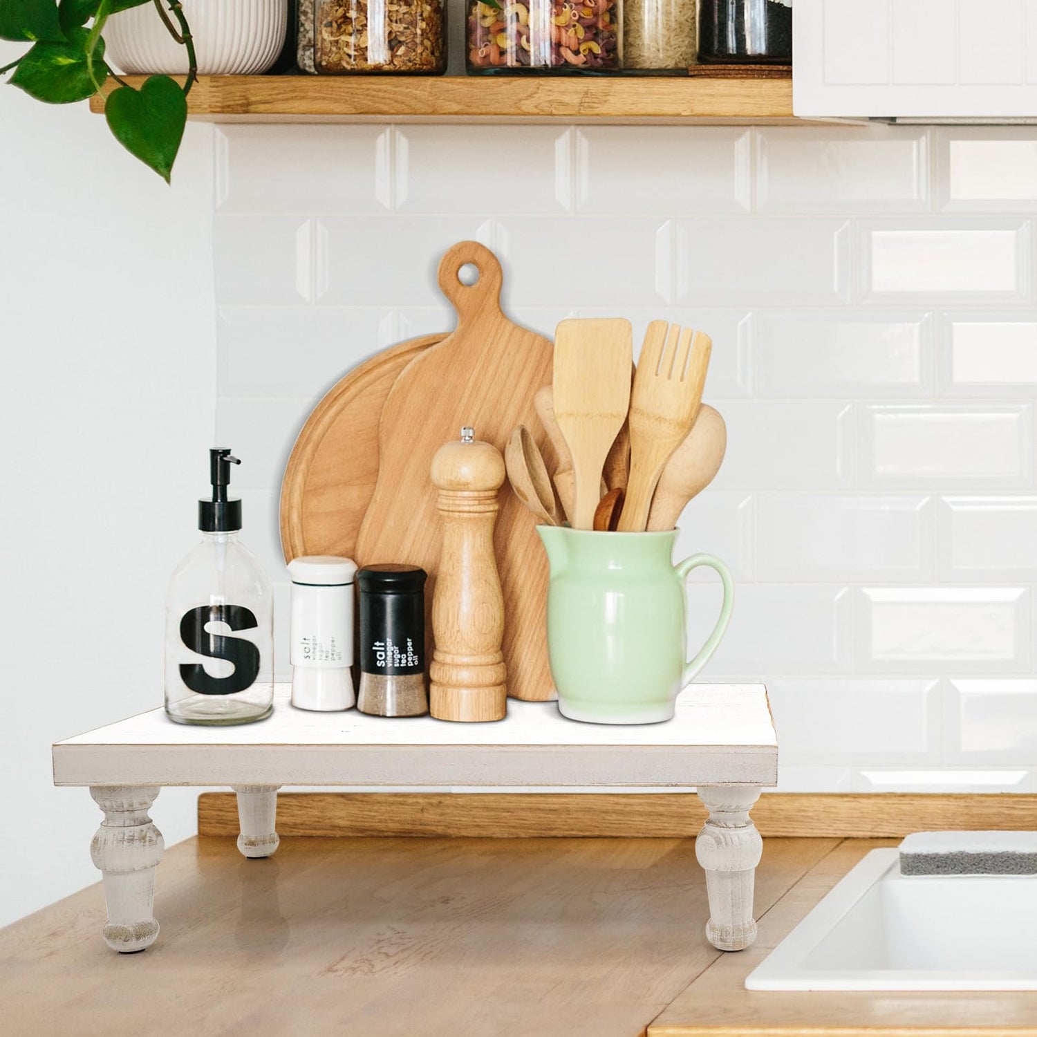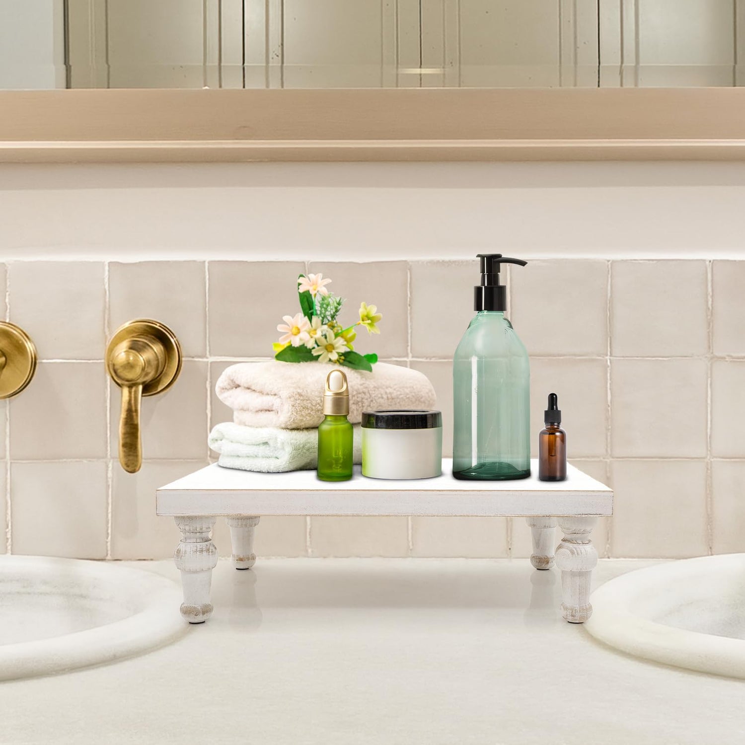 • MULTIPURPOSE -- The wooden stand can be decorated as a dining room, living room table centrepiece. You can display bath bottles, mugs, candles, pottery, small houseplants, flowers, crafts and so on.
