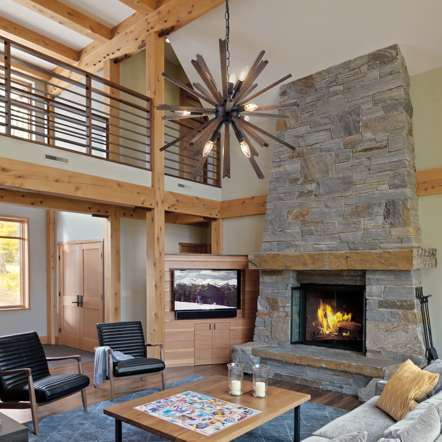 • Sputnik Sphere Design: The pendant light fixture made from metal with a black finish and natural wood as shade. The planks radiate out from the center metal ball and features exposed bulbs. The fixture suits the room from industrial farmhouse to the contemporary minimalist style