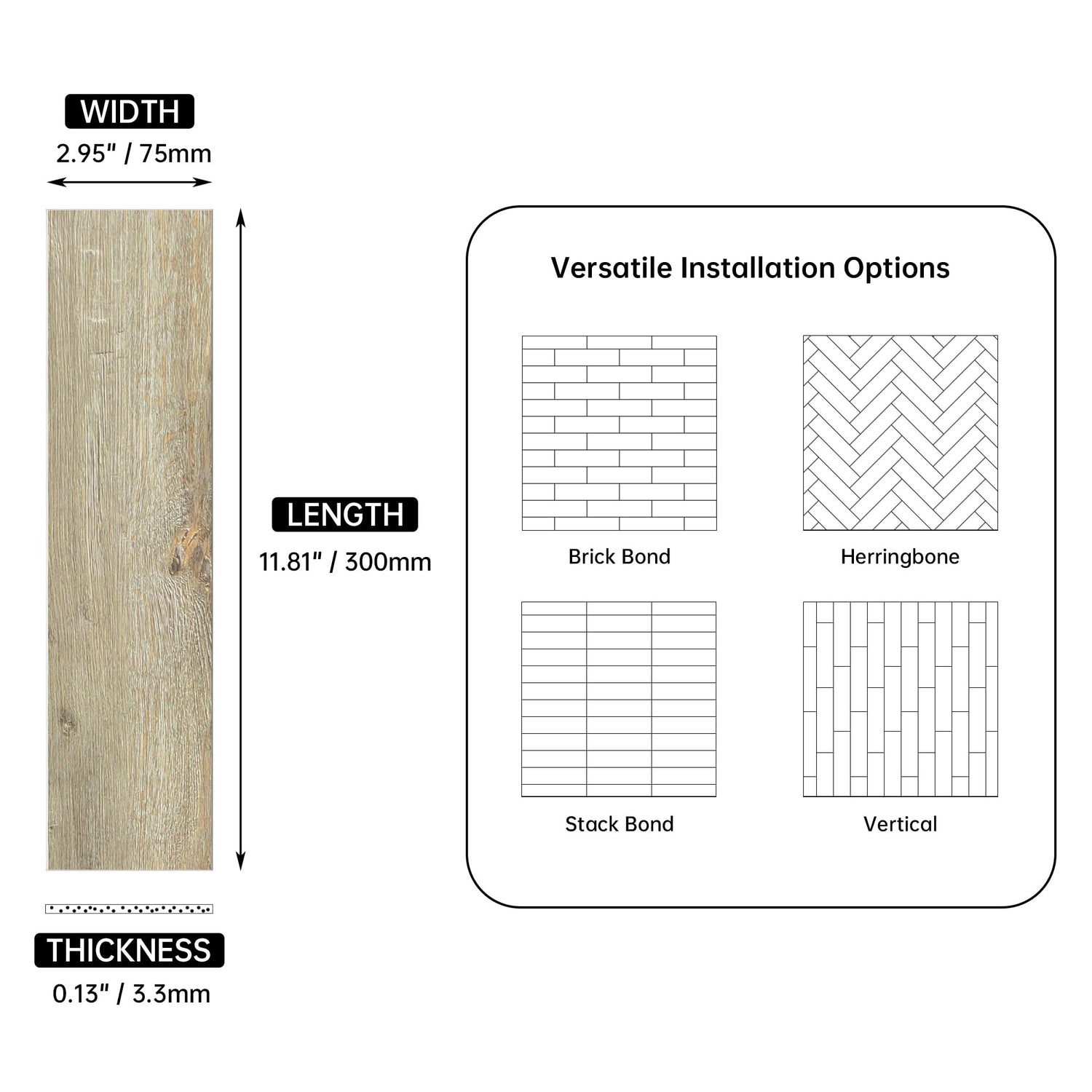 • 「Size & Package」Each tile measures 11.8 "x2.95" x 0.13 " and each box contains 24 tiles with a total area of 5.81 square feet. Four colors to choose from. We recommend taking 5~10% more material in case of cutting wastage