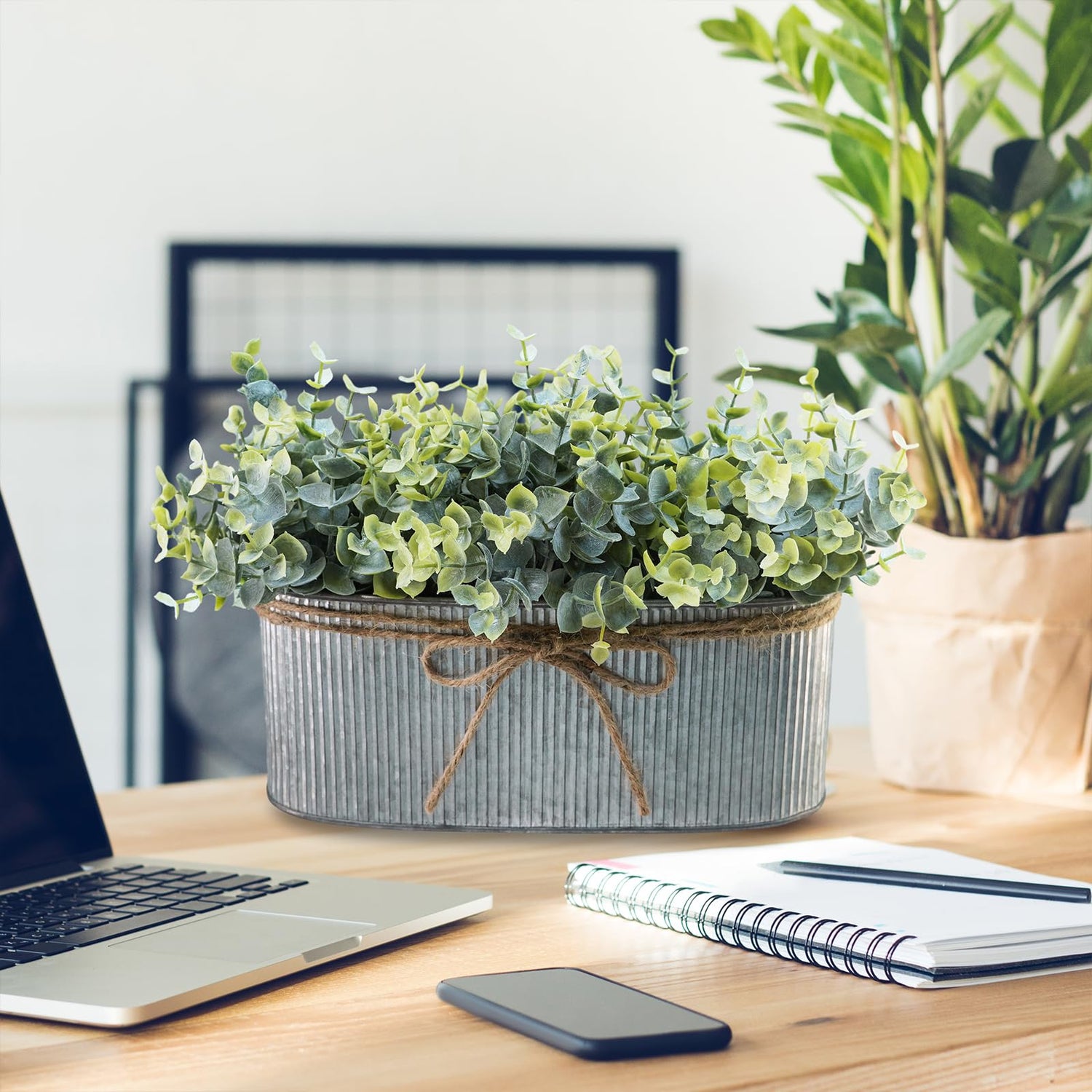 - Place this set of artificial eucalyptus plants and oval metal planter on tabletop, windowsill, office desk, buffet, nightstand, shelves, cabinets, windowsill, fireplace mantel, coffee table, dining table, console table, breakfast nook, kitchen island, living room, bedroom, or anywhere that adds a pop of greenery.
