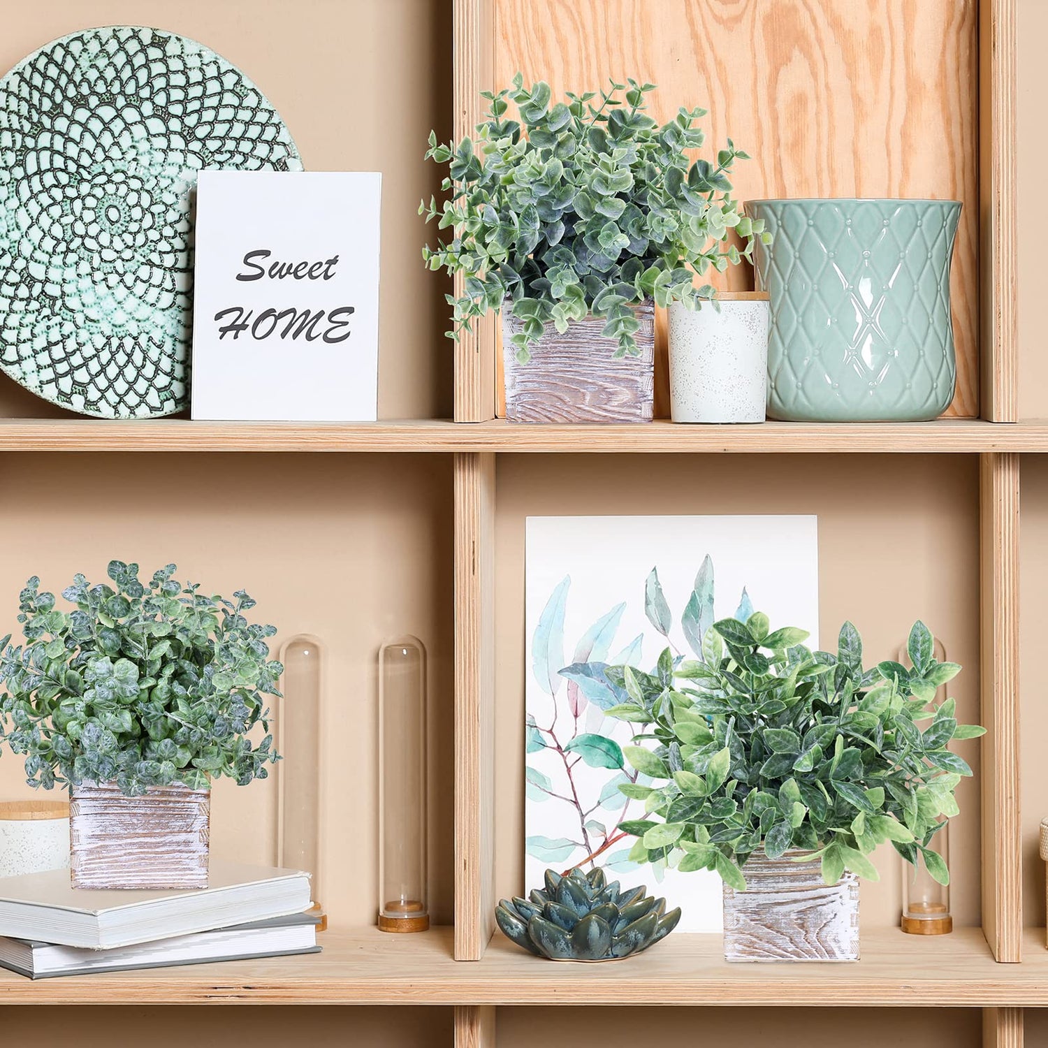 - Assorted artificial potted eucalyptus plants add vibrant greenery and rustic charm to your coffee table, dining table, desk, mantel, windowsill, kitchen countertop, bookshelf, floating shelf, entryway table, bathroom counter, nightstand, bedroom, living room, and corners of your house. Use them as a farmhouse centerpiece for wedding and special events. They are delightful housewarming gift, birthday gift, Mother's Day gift, wedding favor, bridal shower favor, and gifts for special occasions.