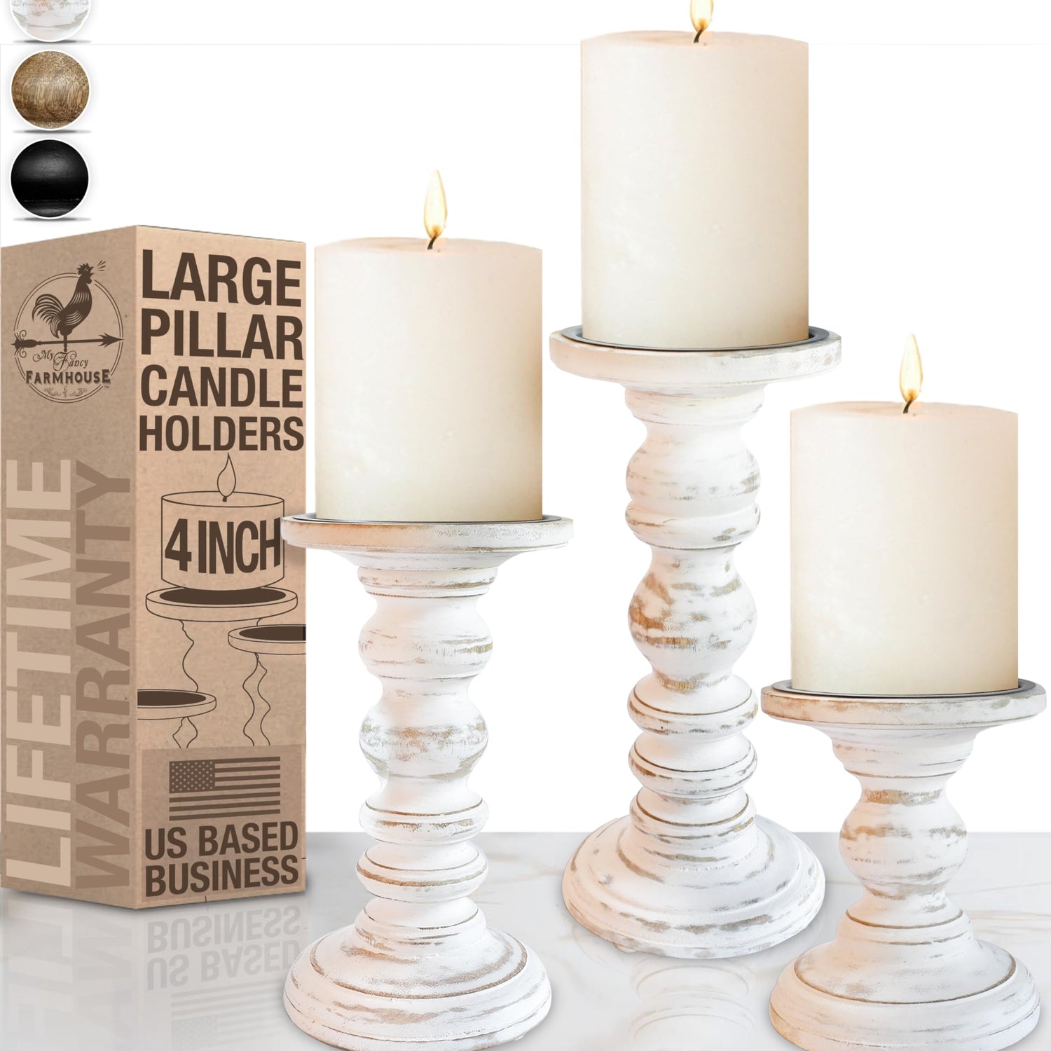 Wood Candle Holders for Pillar Candles (Set of 3) Tall Large Rustic Pillar Candlestick Stands - Fits Both 4 inch and 3 inch Wide Pillar Candles - Modern Farmhouse Decor (Antique White)