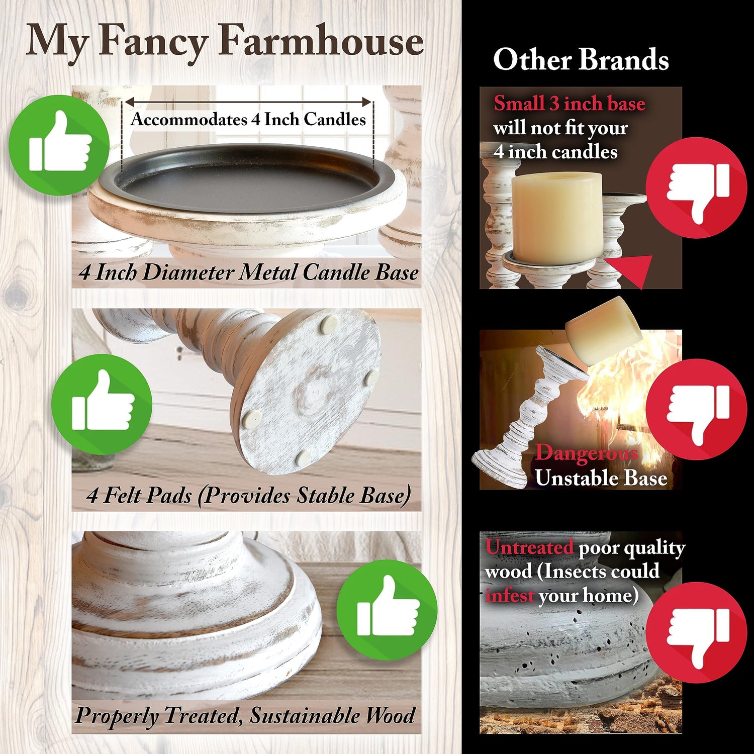 • QUALITY: Not all Wooden Pillar Candle holders are alike. Some of the other candle holders you may find are not made with the same attention to detail as these pillar candle holders. We spend the time to get it right so you are happy with our products for years to come.