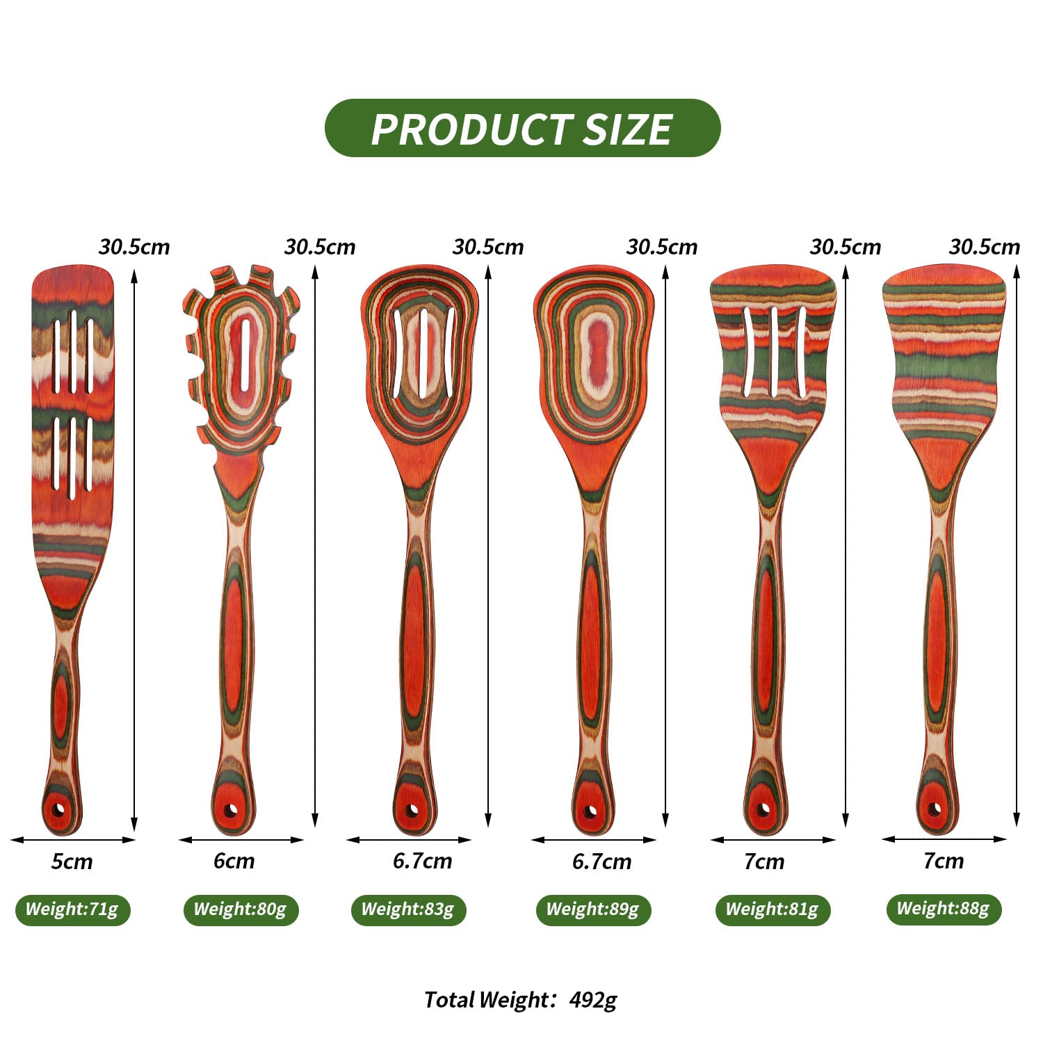 • 🎁【6 Pcs Pakkawood Kitchen Utensils Set】Pakkawood is also made of wood, color wood powder is molded through high-density insulation board process Texture and color can be controlled by craft. The