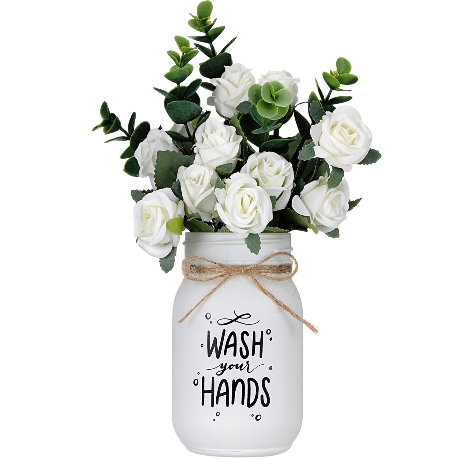 XunYee Farmhouse Bathroom Decor Wash Your Hands Sign Mason Jar with Flowers 16.9 oz White Mason Jar Centerpiece Table Rustic Decor for Restroom Bathroom Shelf Bridal Shower Kitchen