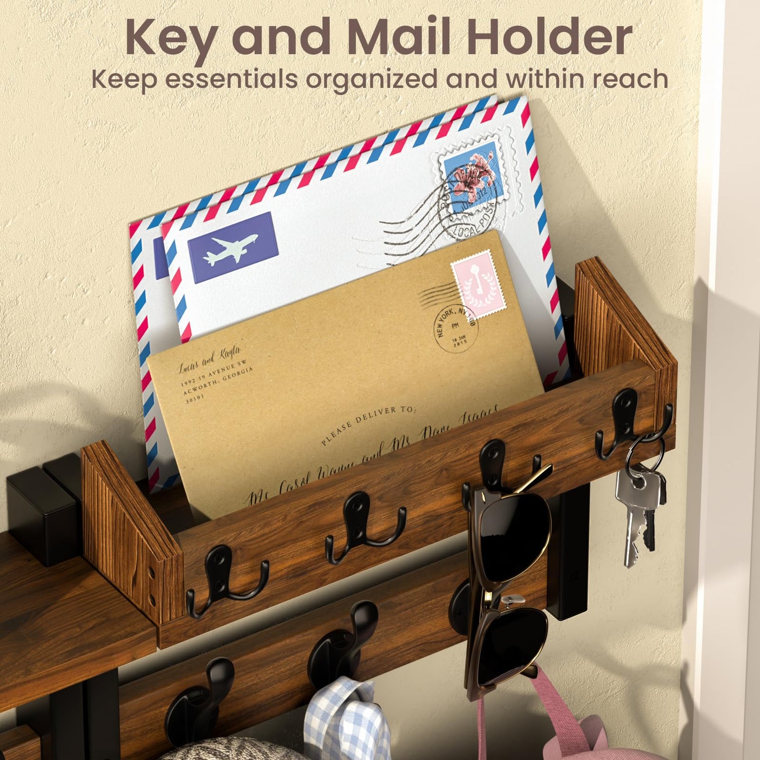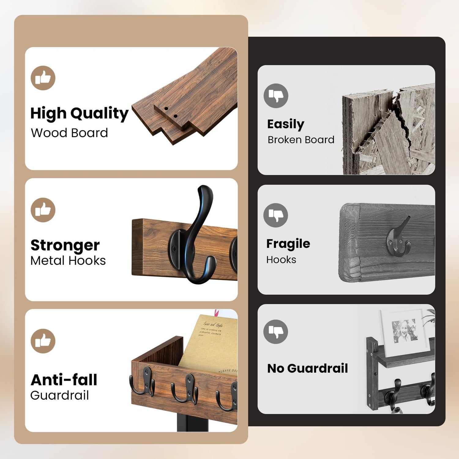 • 【Made to Last】Crafted from solid wood and metal frames, this shelf with hooks comes with 7 reinforced coat hooks and 4 key hooks ensure a reliable hold for heavy coats, backpacks, dog leashes, purses and keys; Metal Frames and dual-hole mounting provides extra stability