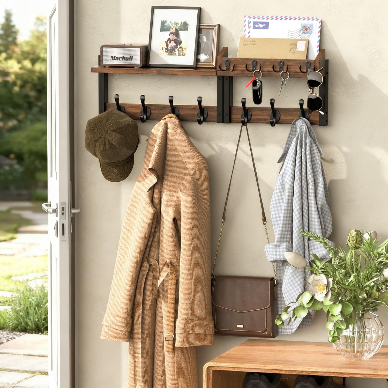 • 【4-in-1 Wall Organization】This universal wall rack hooks designed with 4 key hooks, 7 coat hooks, 1 mail organizer and 2 wide display shelf, making it perfect for storing coats, backpacks, dog leashes etc; The shelf on top adds a nice touch for displaying small items like photos or placing keys