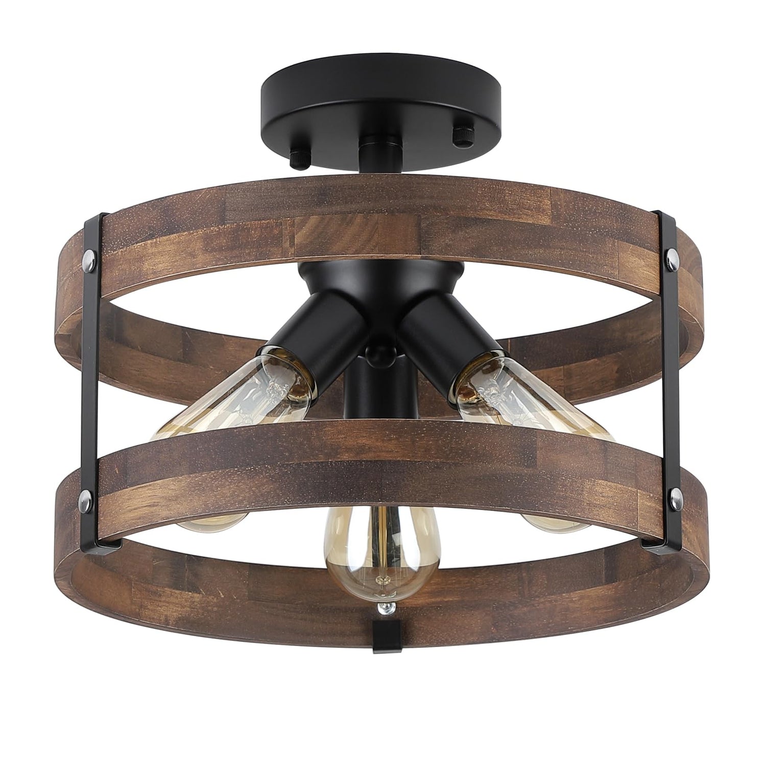3-Light Rustic Farmhouse Wood Flush Mount Ceiling Light Fixture Oak Wood Round Drum Semi Flush Mount Ceiling Light for Hallway Hall Entry Bedroom Farmhouse Indoor, Black