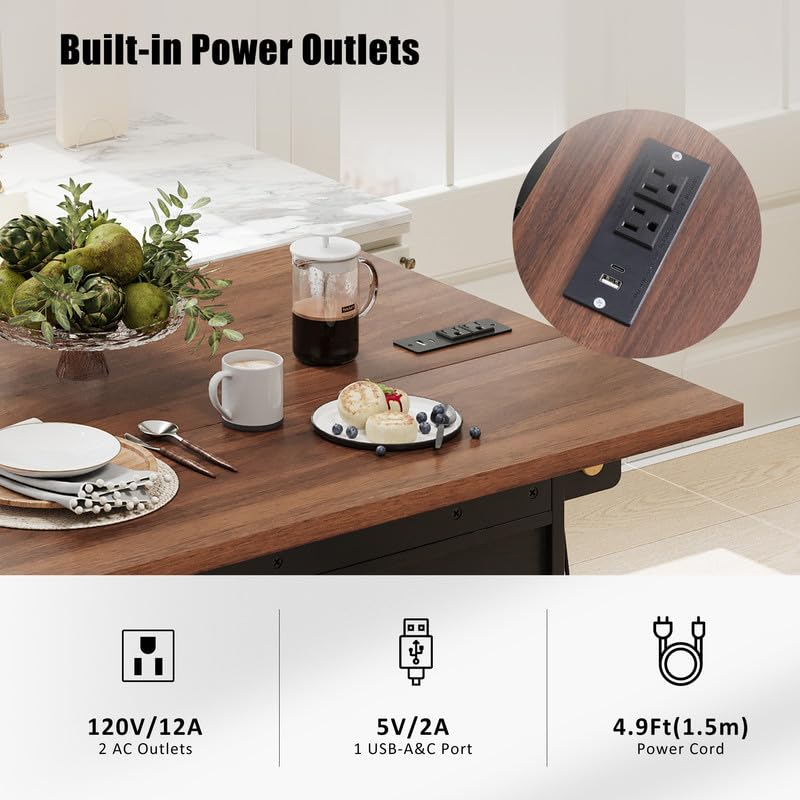 - [Countertop with Power Supply] This beautifully designed kitchen cart features a sophisticated built-in charging station with 2 AC outlets, 1 USB port, and 1 TYPE-C port that effortlessly adapts to the power needs of all your kitchen appliances. Elevate your culinary experience by conveniently charging your coffee maker, juicer, and toaster on the wood grain countertop of this farmhouse kitchen island.