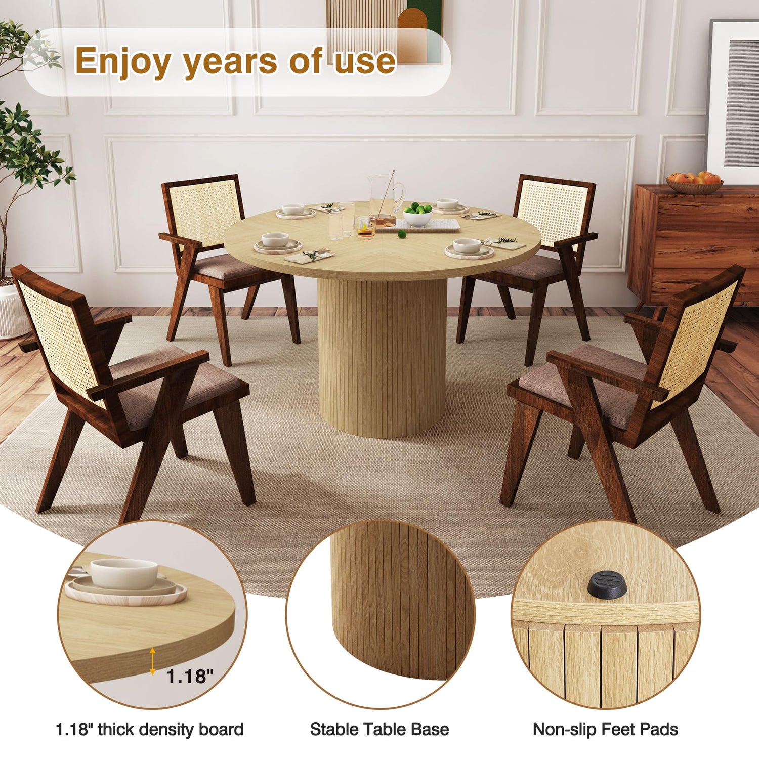 - Farmhouse Round Dining Table: Featuring a spacious tabletop and a classic farmhouse design, this kitchen dining table brings rustic elegance to any room. The charming farmhouse aesthetic, paired with a sturdy rattan circular base, creates a warm and welcoming atmosphere for gatherings with family and friends.