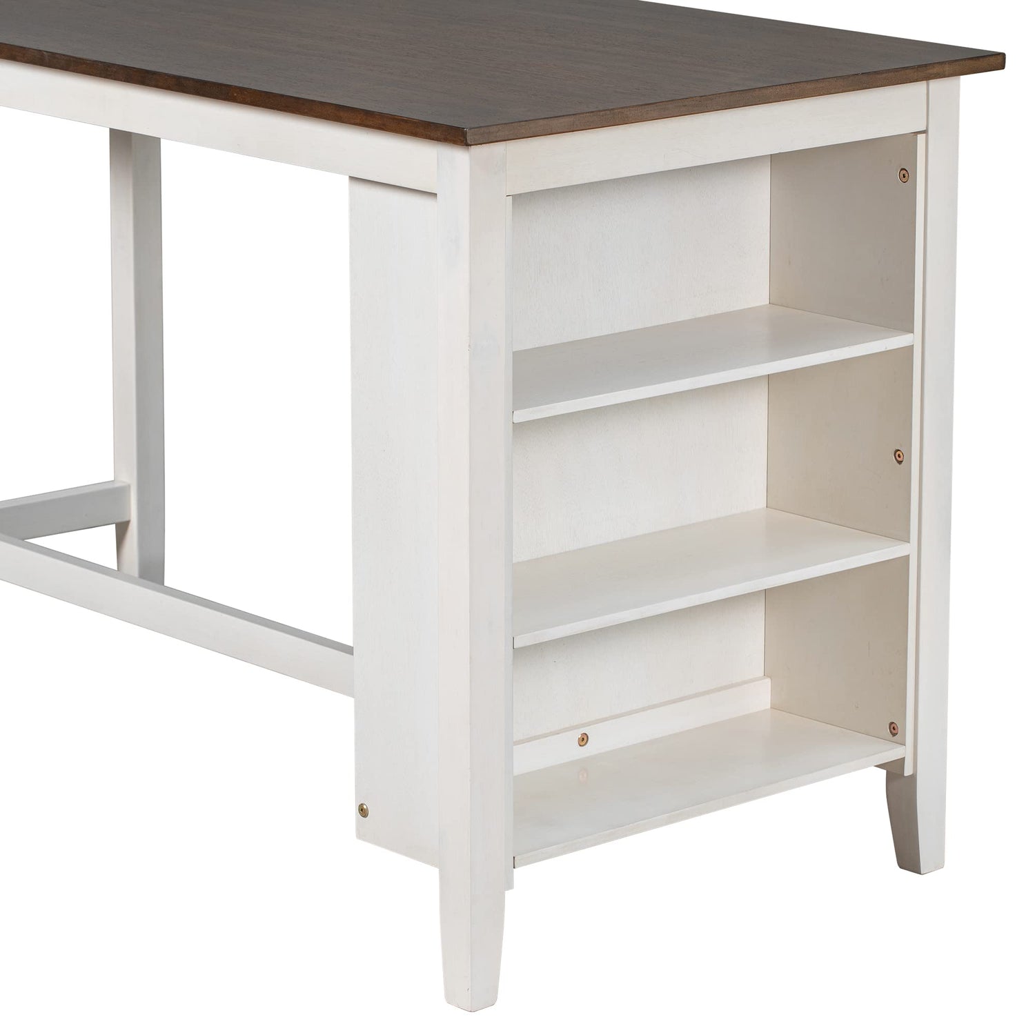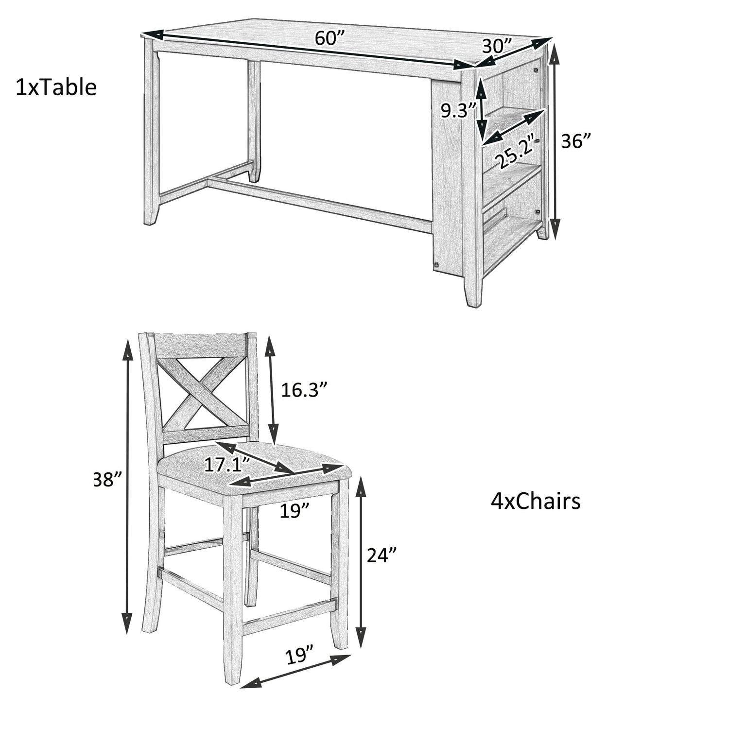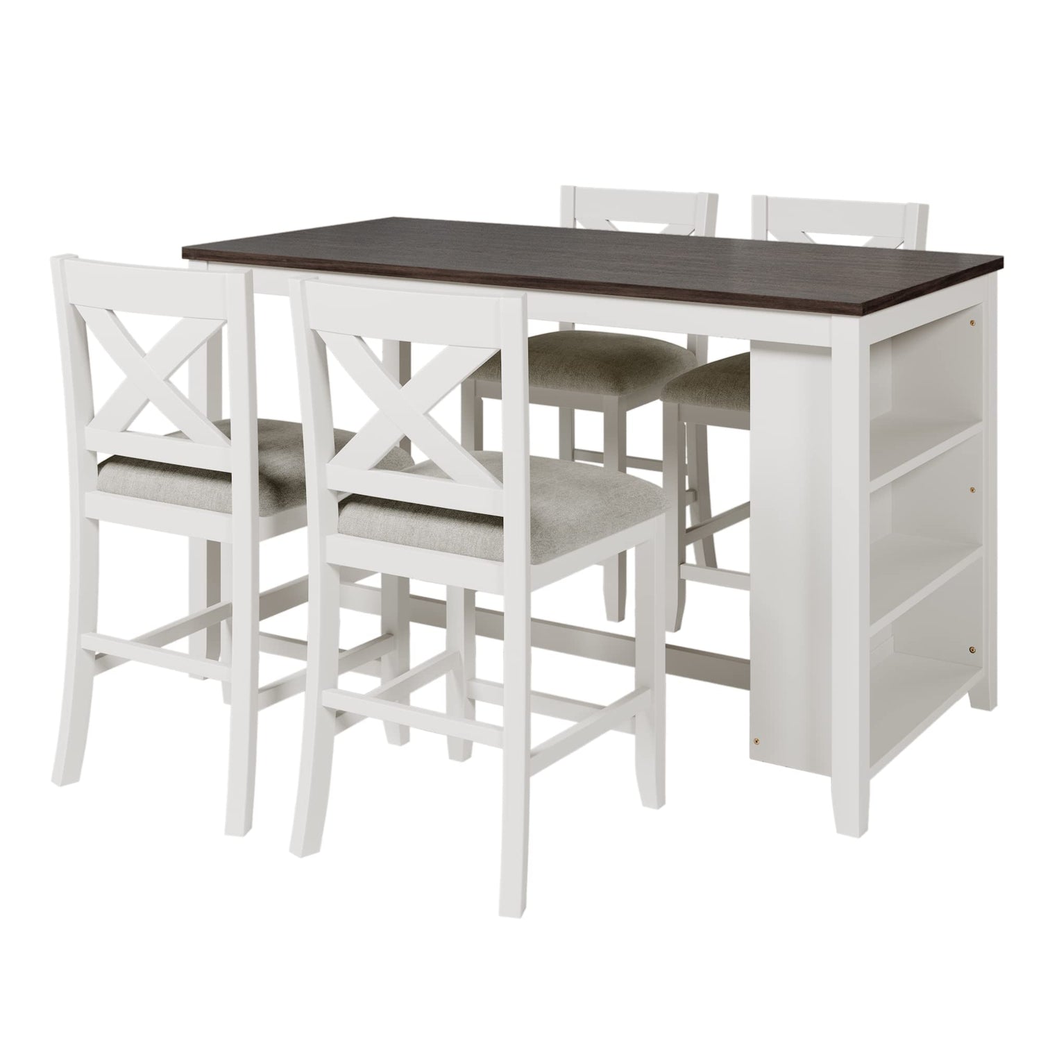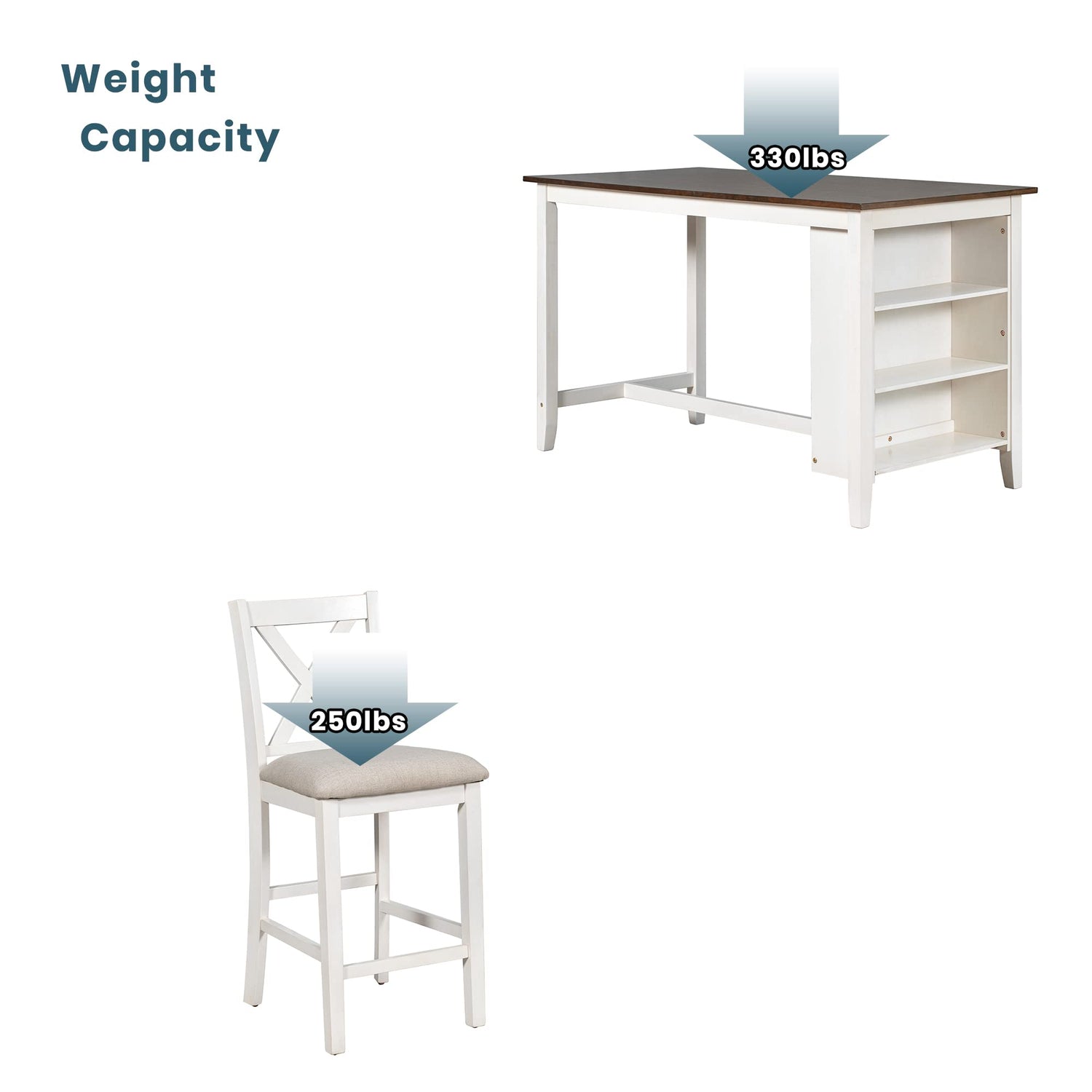 Details: 5 Pieces Counter Height Wooden Bar Table Set with 3-Tier Shelf and 4 Chairs, Rustic Farmhouse Dining Table Set for 4, White
