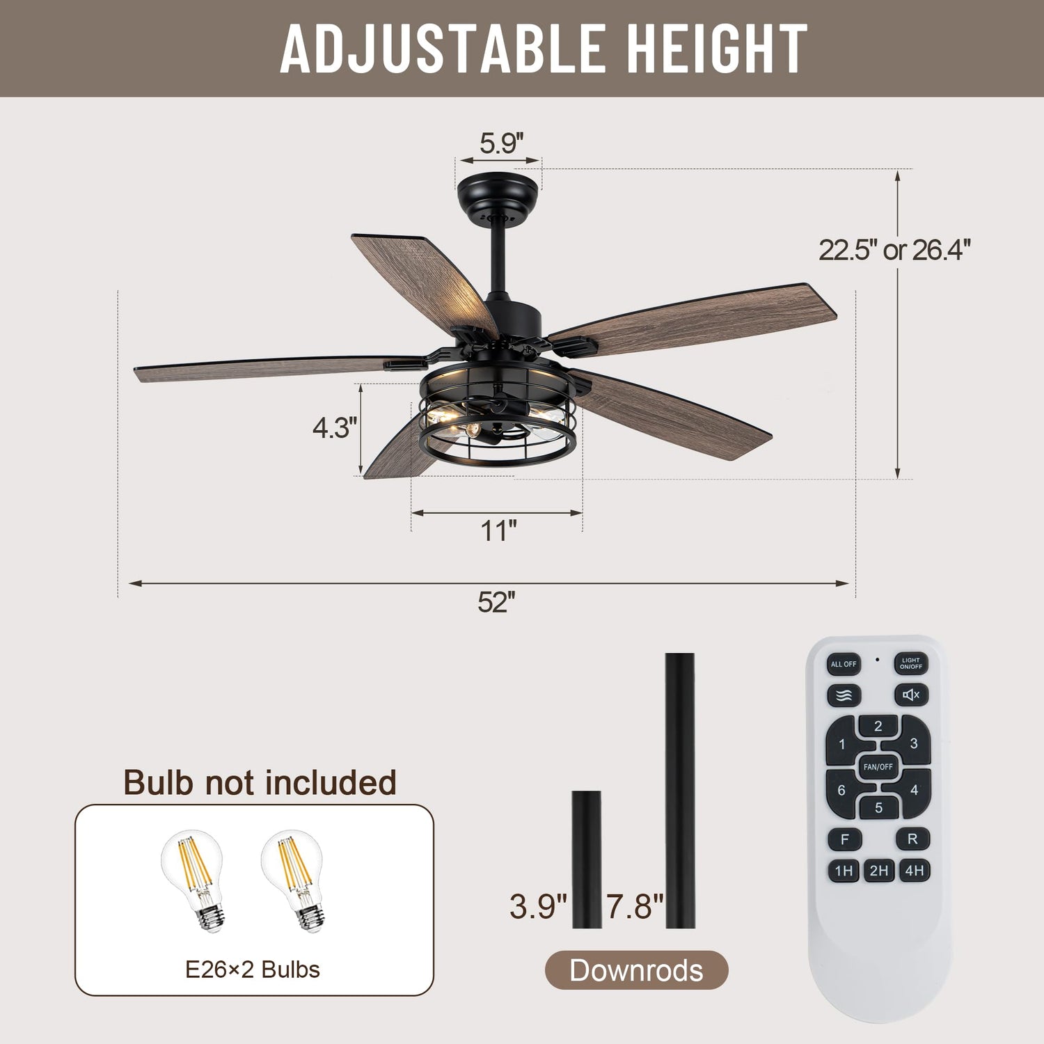 • 52 Inch Ceiling Fan With Lights —— Classic farmhouse style, the perfect combination of design and function, featured with a matte black body, 5 double-finished distressed pine / dark maple reversible blades, and with 2*E26 bulbs base which supports dimmable bulbs(not included), this 52-in ceiling fan is ideal for medium to large rooms up to 400 sq. ft. such as living rooms, bedrooms, dining rooms, etc.
