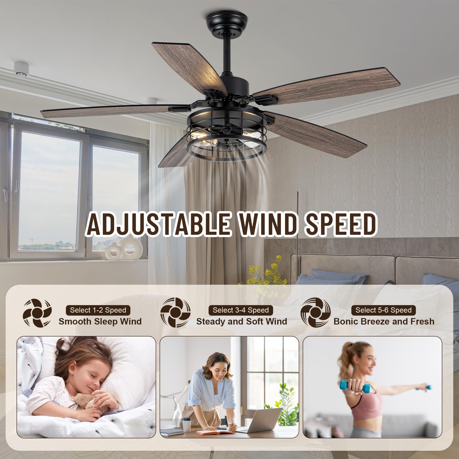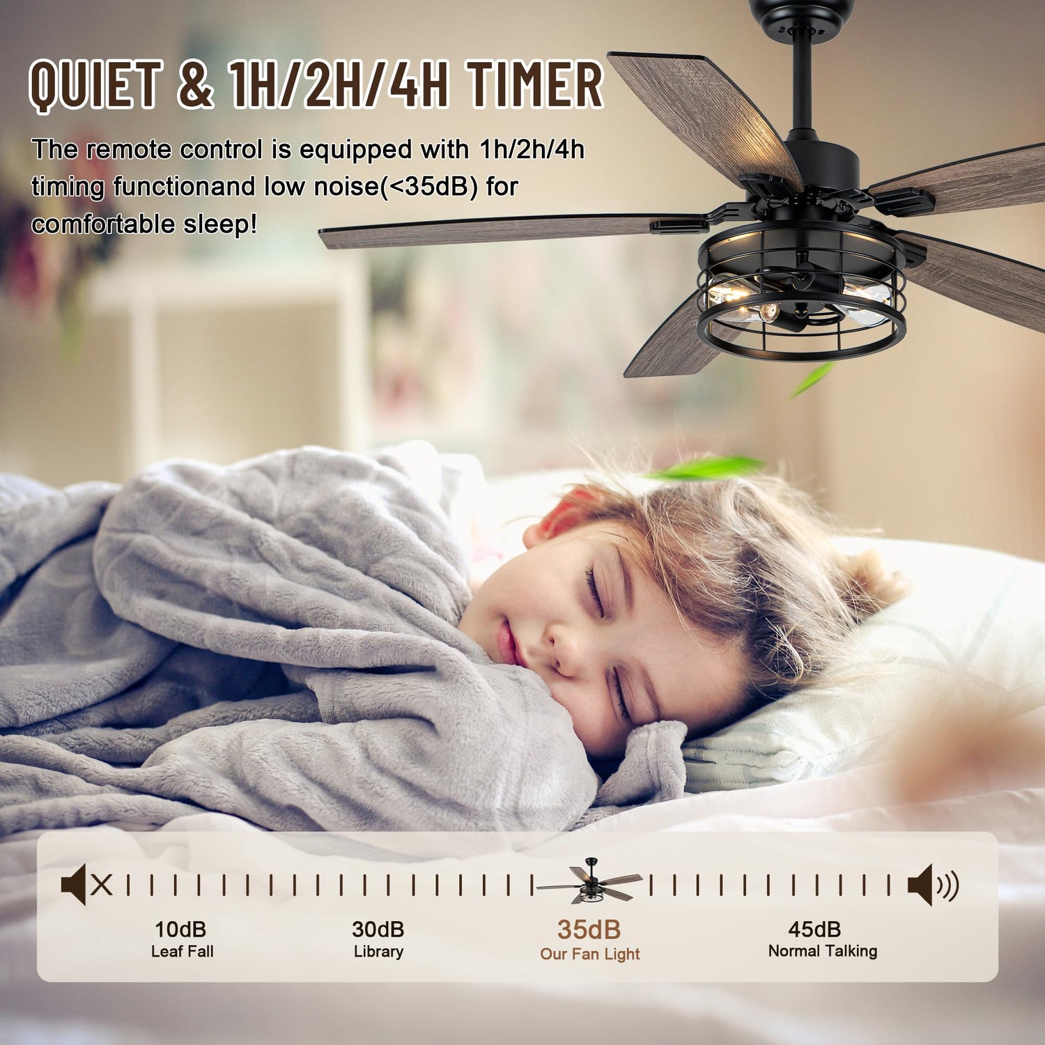 • High-Quality DC Motor —— The bedroom ceiling fan with lights features a durable, energy-saving high-quality DC motor. Compared to traditional AC motors, DC motors are more efficient and support 6-speed adjustment. This reduces electricity costs and ensures quiet operation.