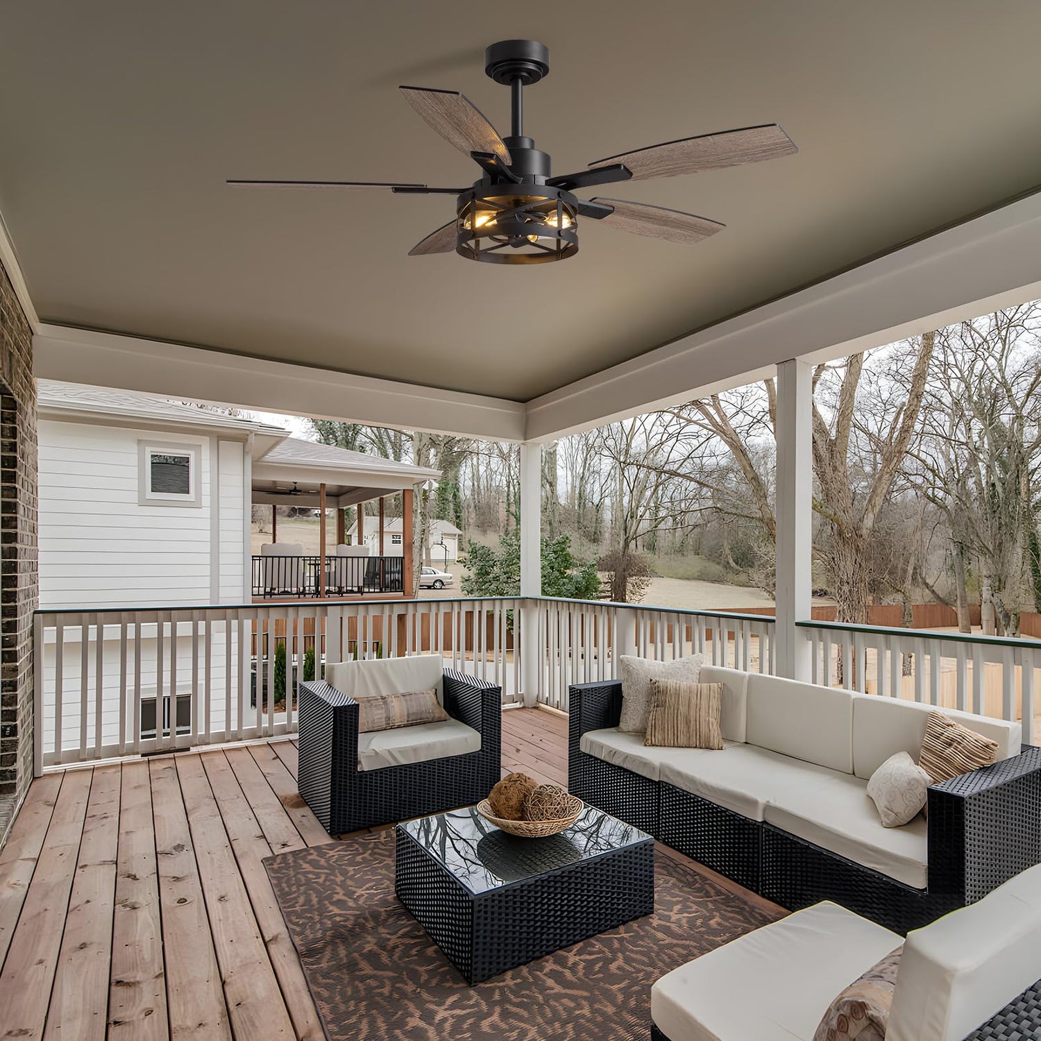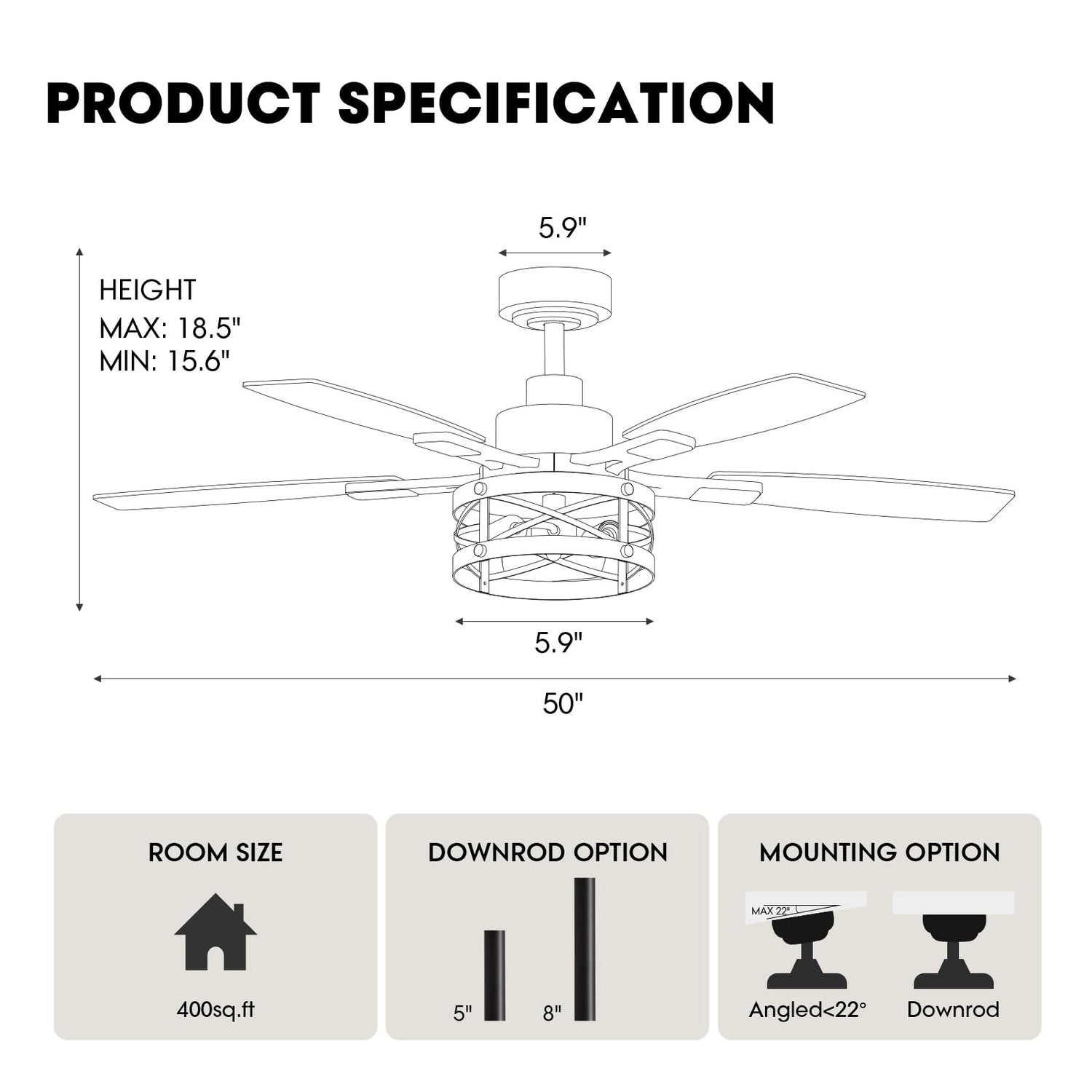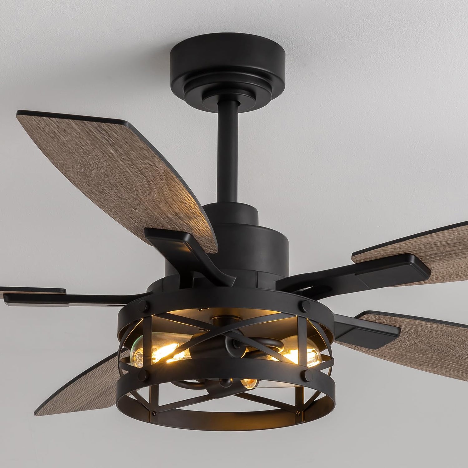 - MODERN DESIGN: Industrial-style ceiling fan featuring a black metal finish, geometric cage light fixture, and 5 weathered gray blades for contemporary appeal
